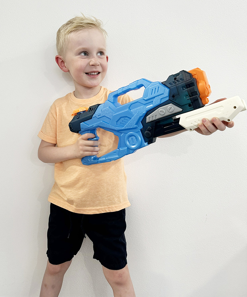 Pevná a krásna vodná pištoľ s tromi tryskami. Pištoľ má 1000 ml veľký zásobník na vodu. Boj bude dlhý. Veľký zásobník ho zaručí.