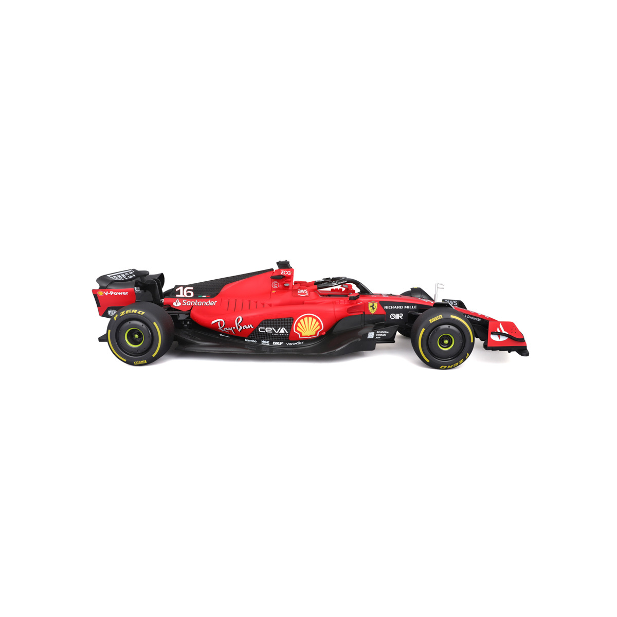 RC Formula Racing Ferrari SF-23 - #16 Charles Leclerc v měřítku 1:10 je precizně zpracovaná replika, která zachycuje elegantní aerodynamický design a výraznou červenou barvu soutěžního vozu Ferrari Formule 2023. Je zkonstruován pro rychlost a hbitost a nabízí nadšencům strhující závodní zážitek, který zahrnuje autentické zvuky motoru SF-23. Přibližně 57 cm dlouhý. Autentické zvuky Ferrari SF-23. 2,4 GHz pro špičkový výkon. Až 4 hráči mohou řídit v jednom okamžiku a na jednom místě. Dosah ovládání 35 metrů. Ovladač v profesionálním stylu s proporcionálním ovládáním rychlosti. Nastavení seřízení řízení. Vozidlo využívá lithiovou dobíjecí baterii (je součástí balení). Nabíjecí kabel USB (součástí dodávky). Nabíjení baterie trvá přibližně 2,5 hodiny. Ovladač funguje na 2 baterie AA (jsou součástí). Baleno v krabičce. Rozměry auta: 20,27 x 12,18 x 57,08 cm. Rozměr balení: 21,6 x 67,3 x 24,5 cm. Věk: 8+