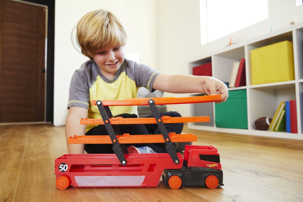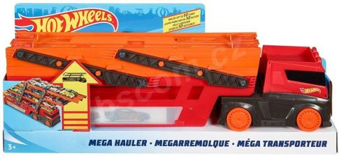 Užite si veľké dobrodružstvo s týmto mega traktorom Hot Wheels®, ktorý so sebou prináša úplne nové autá. Do tohto mega ťahača môžete naložiť viac ako 5 áut vďaka šiestim rozkladacím podlahám, a to je len začiatok! Pripoj mega traktor k oranžovej dráhe Hot Wheels®, rozbehni sa na plný plyn v klasických pretekoch bok po boku a zisti, ktoré z tvojich áut je najrýchlejšie!