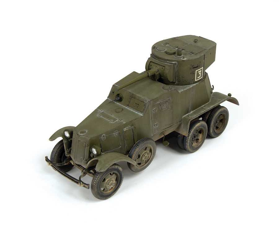 Informace o modelu: Obrněný vůz BA-3, model 1934. Obrněný vůz BA-3, vyrobený v roce 1934, měl nejsilnější dělostřeleckou výzbroj ze všech obrněných vozů své doby. BA-3 byl vybaven věží tanku T-26 a 45mm kanónem. BA-3 bojoval proti japonským silám u řeky Chalchin Gol, v Zimní válce s Finskem a na bojištích Velké vlastenecké války během jejího nejtěžšího počátečního období.