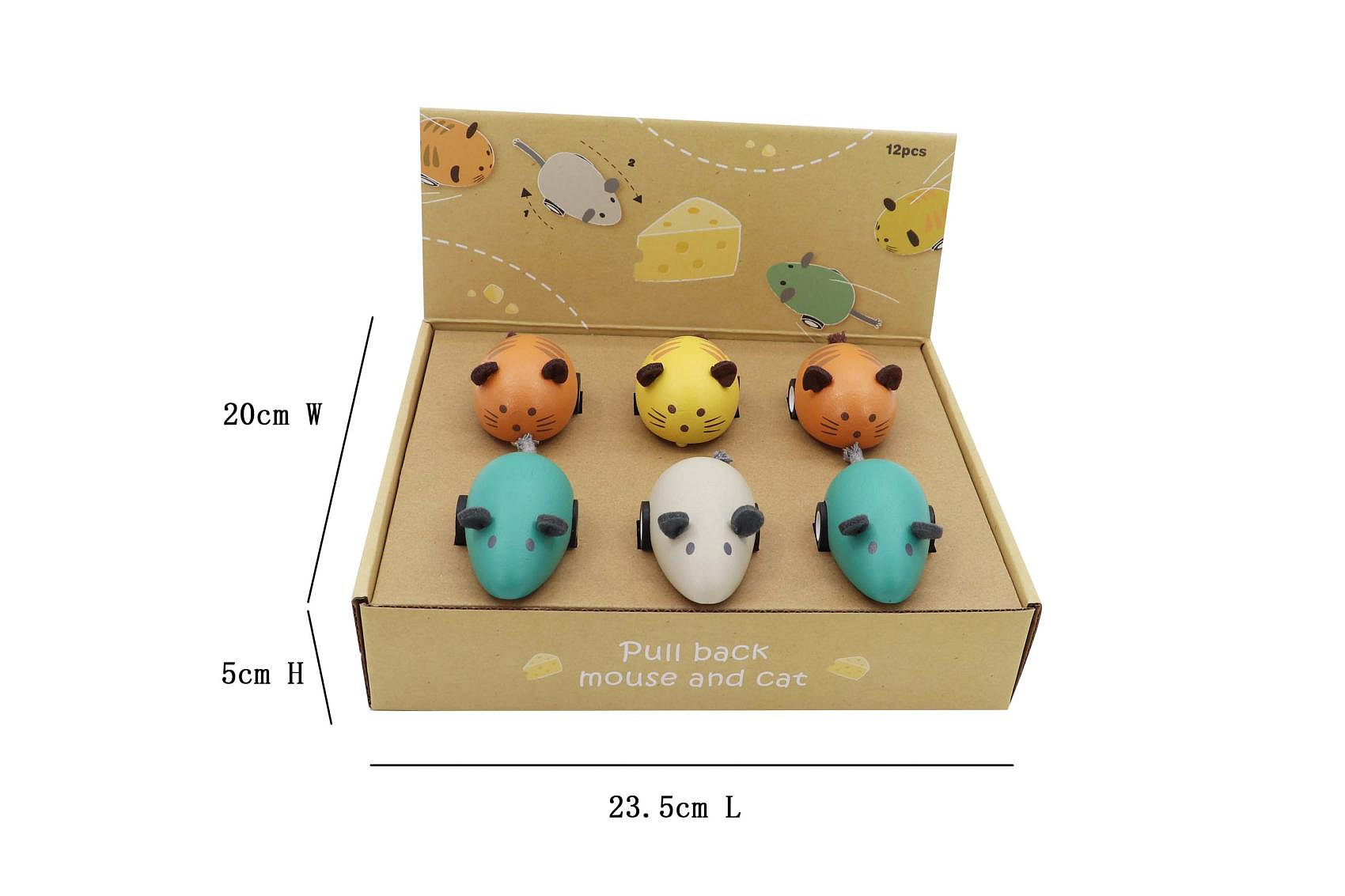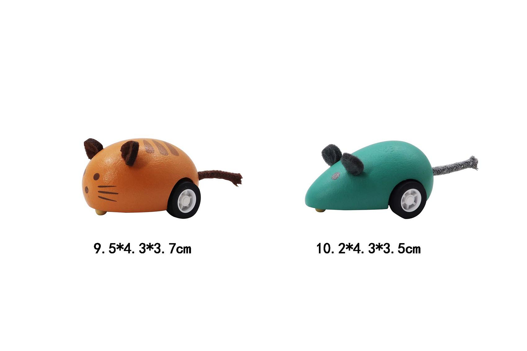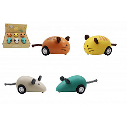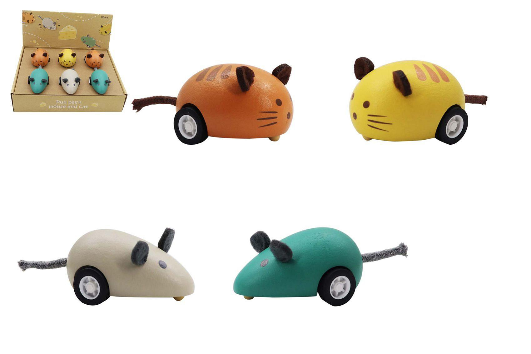 Zvířátko jezdící dřevěné. Rozměry 10,2x4,3x3,5 cm a 9,5x4,3x3,7 cm. Na zpětné natažení. 12 ks display box. 4 varianty - myš zelená, myš bílá, kočka žlutá, kočka oranžová.