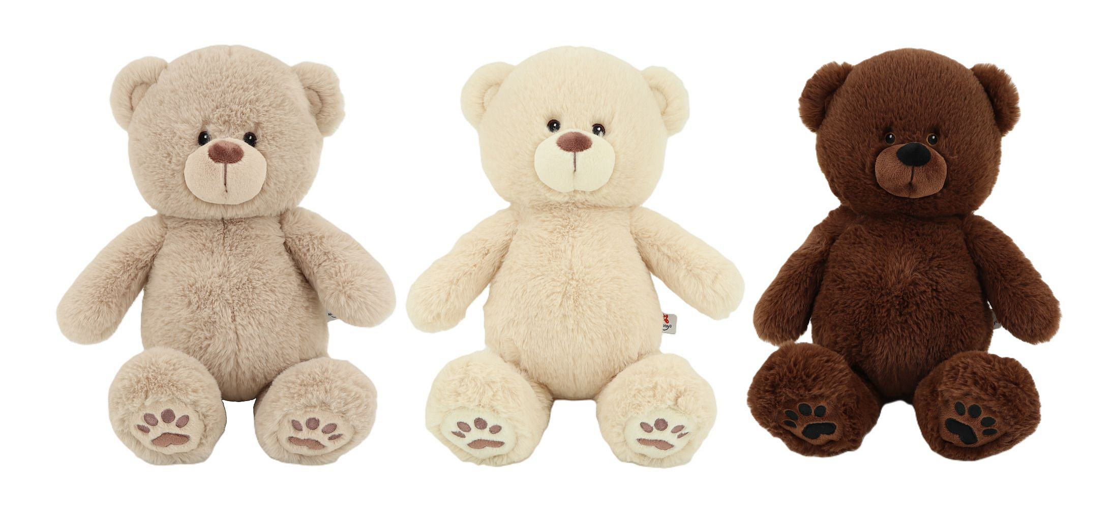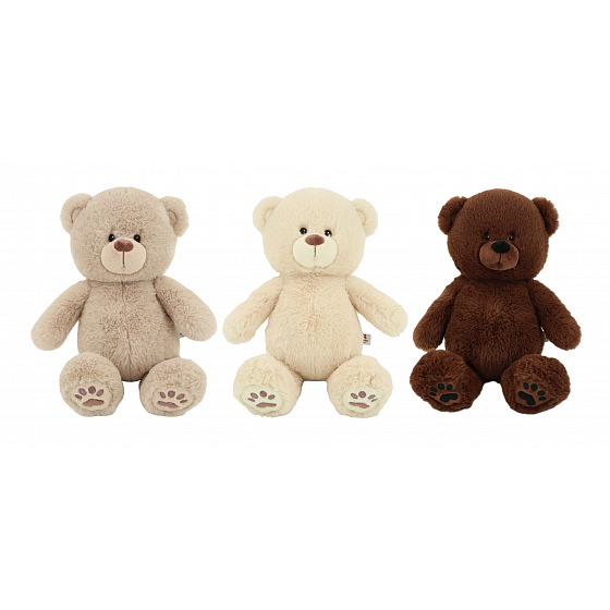 Heboučký plyšový medvídek, vyšitá očíčka i tlapičky na nožičkách. 3 barevná provedení. Béžový, světle hnědý nebo tmavě hnědý. Výška medvídka 40 cm, vsedě 28 cm.