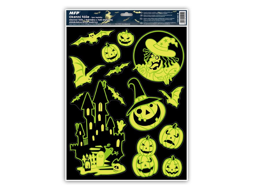 Okenné fólie svietiace - Halloween. Vyzdobte si okno týmito strašidelnými samolepkami na okno. Vytvorí Vám tú pravú halloweensku atmosféru. Vhodné sú na akékoľvek hladké plochy, napríklad sklo, výlohy, zrkadlá alebo kachličky. Čisté, bez lepidla a opakovane použiteľné.NÁVOD:1. Zlúpnite z podložky obrázok a umiestnite na čisté, prípadne navlhčené sklo stranou, ktorá bola na podložke. 2. Obrázok elektrostaticky priľne.3. Fólia sa ľahko zlúpne a dá sa premiestniť. Dodávame v mixe po 4 ks podľa skladovej zásoby. Uvedená cena je za 1 ks.