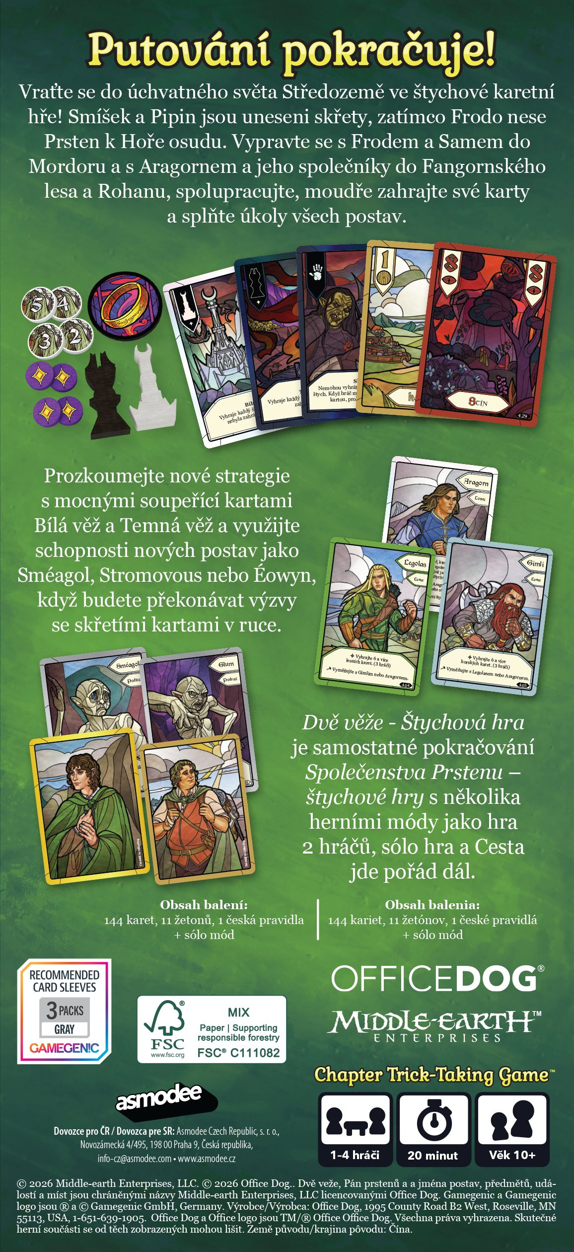 Dvě věže - Štychová karetní hra je samostatné pokračování Společenstva Prstenu – štychové karetní hry (kapitoly 1 až 18 naleznete v předchozí hře.) s několika herními módy jako hra 2 hráčů, sólo hra a Cesta jde pořád dál.