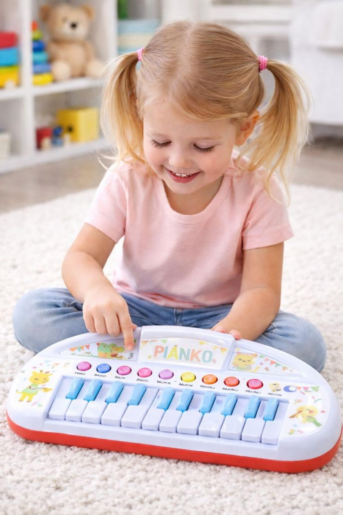 Barevné dětské piánko s roztomilými motivy zvířátek je ideální první hudební hračka pro nejmenší děti. Piánko nabízí jednoduché ovládání, příjemné zvuky a veselé melodie, které podporují rozvoj hudebního sluchu, rytmu a jemné motoriky. Díky lehké plastové konstrukci je piánko snadno přenosné a bezpečné pro malé dětské ruce. Obsahuje klávesy a tlačítka s různými hudebními režimy a zvuky, které děti zábavnou formou seznamují se světem hudby. Hračka je napájena bateriemi a dodávána v barevné krabici, vhodné i jako dárek.