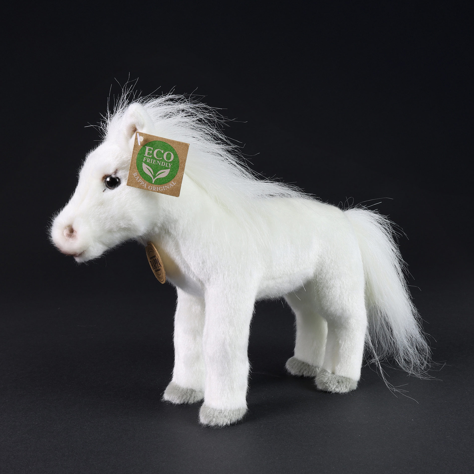 Plyšový kůň měří 24 cm a díky těm nejkvalitnějším materiálům se řadí do Exkluzivní kolekce plyšových hraček značky Rappa. Díky ručnímu zpracování každého kusu navíc vypadá jako živý. Proč označení ECO-FRIENDLY? Rappa si je vědoma všech dopadů na životního prostředí, zaměřuje se na udržitelnost a omezení používání plastů na minimum. Proto je výplň hraček vyrobena z recyklovaných materiálů, zejména PET lahví. Ta je však zcela nezávadná a vhodná i pro děti od narození. FUN FACT: Věděli jste, že koně mají opravdu skvělý zrak a jejich oči jsou větší než oči téměř všech ostatních suchozemských savců?