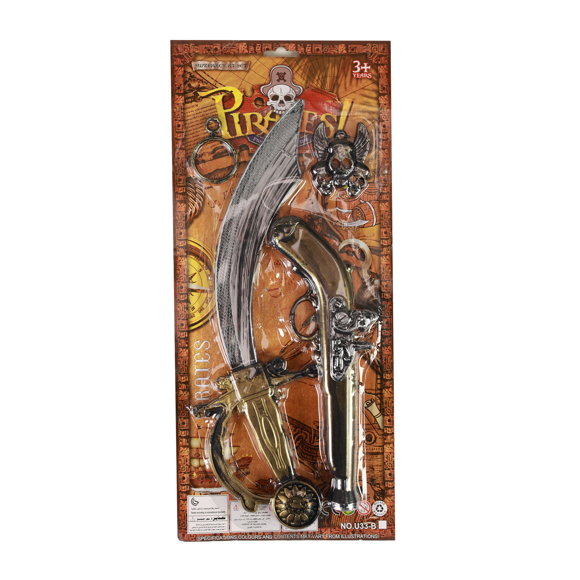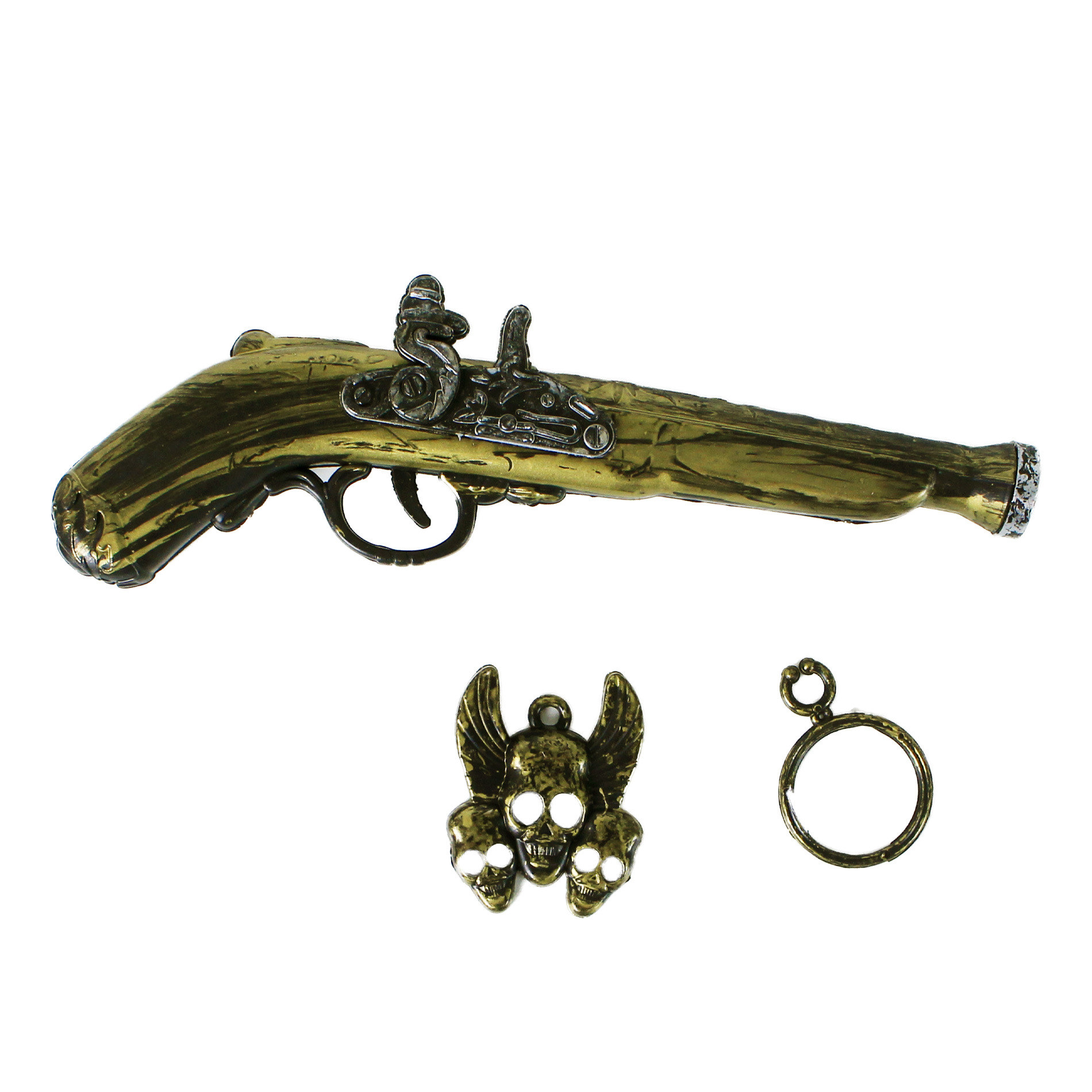 Pirátska súprava pre všetkých malých pirátov! Set obsahuje strieborný meč s bronzovou rukoväťou, bronzovú pištoľ, náušnicu a pirátsky prívesok. Perfektné doplnky ku kostýmu piráta alebo len tak na hranie!