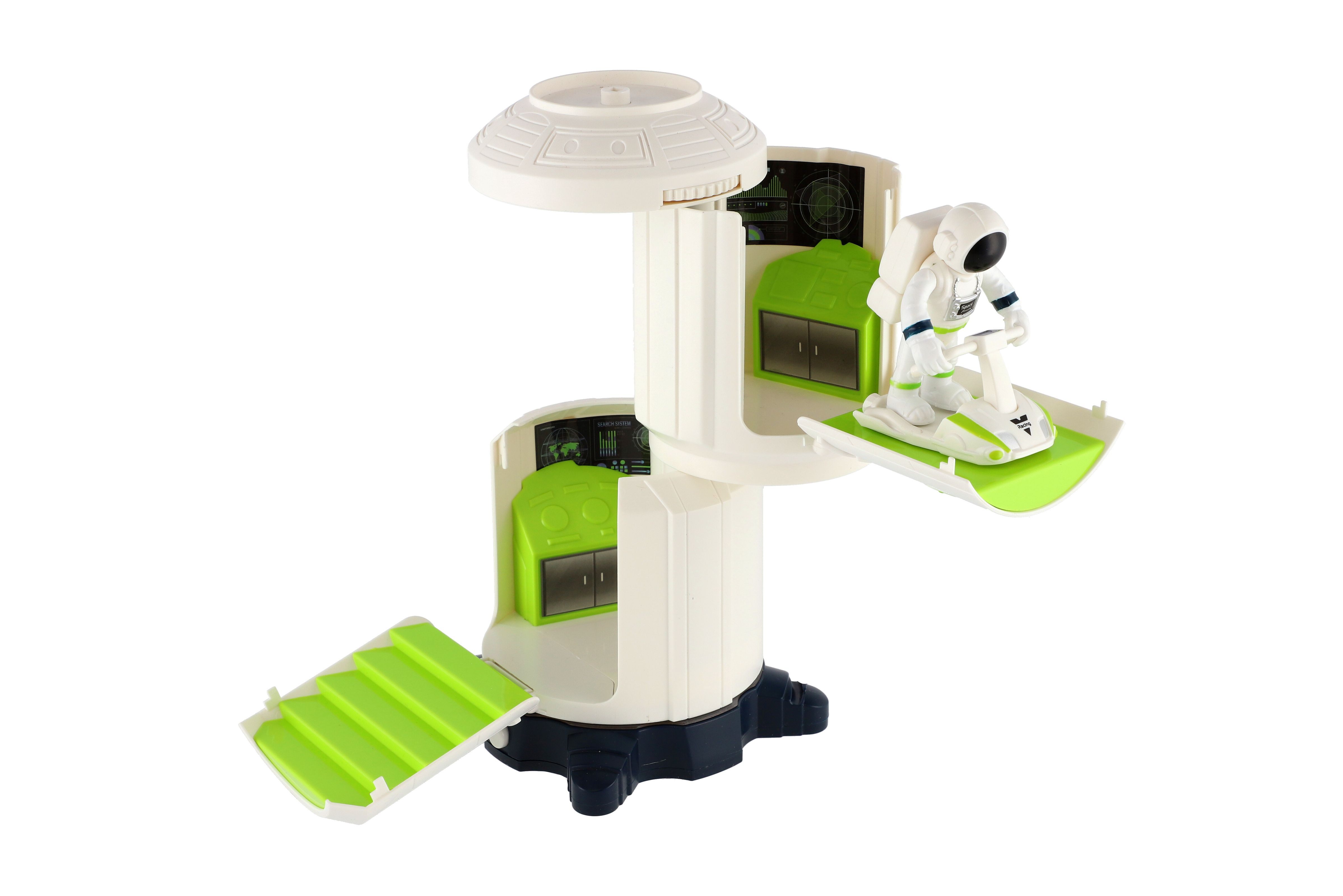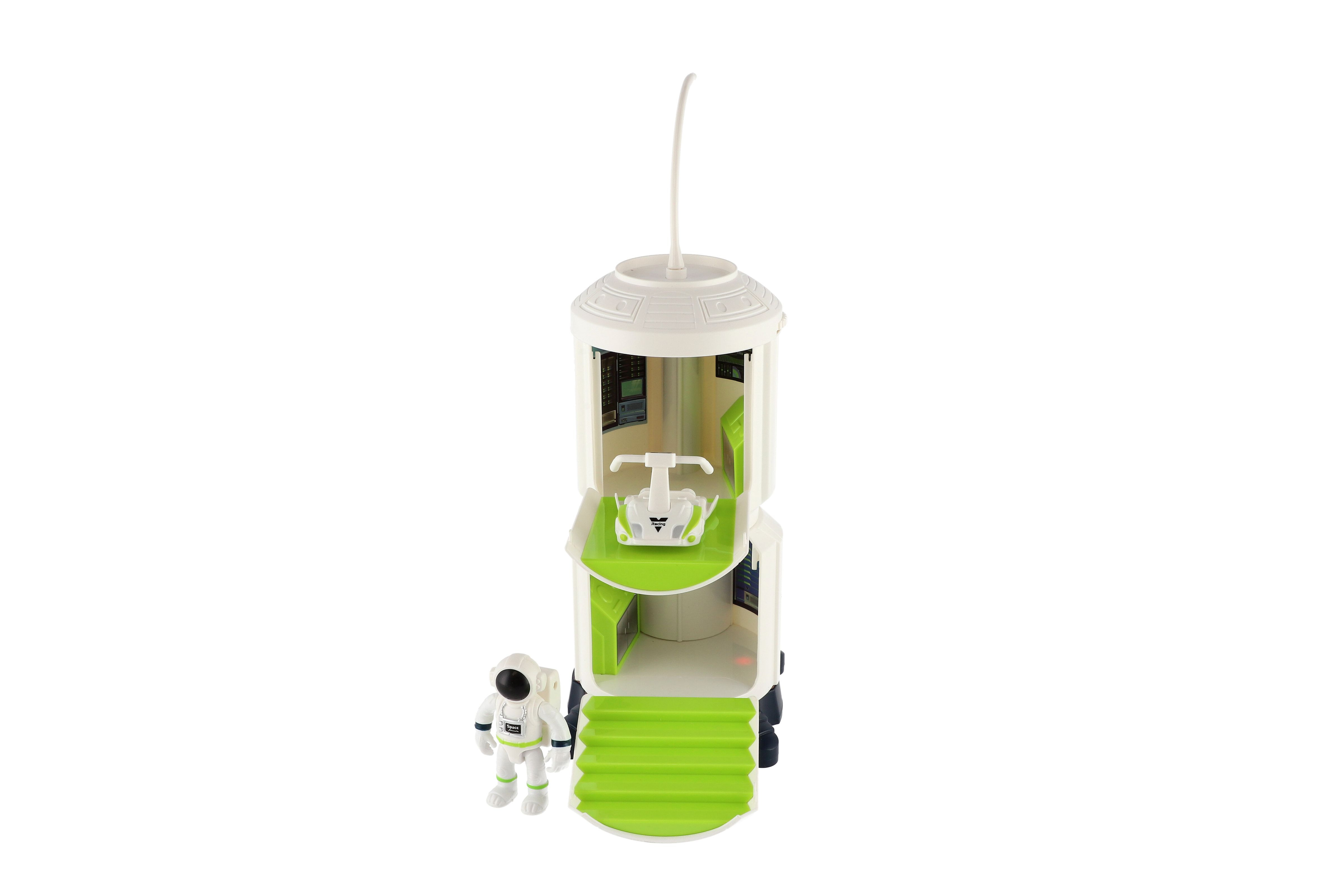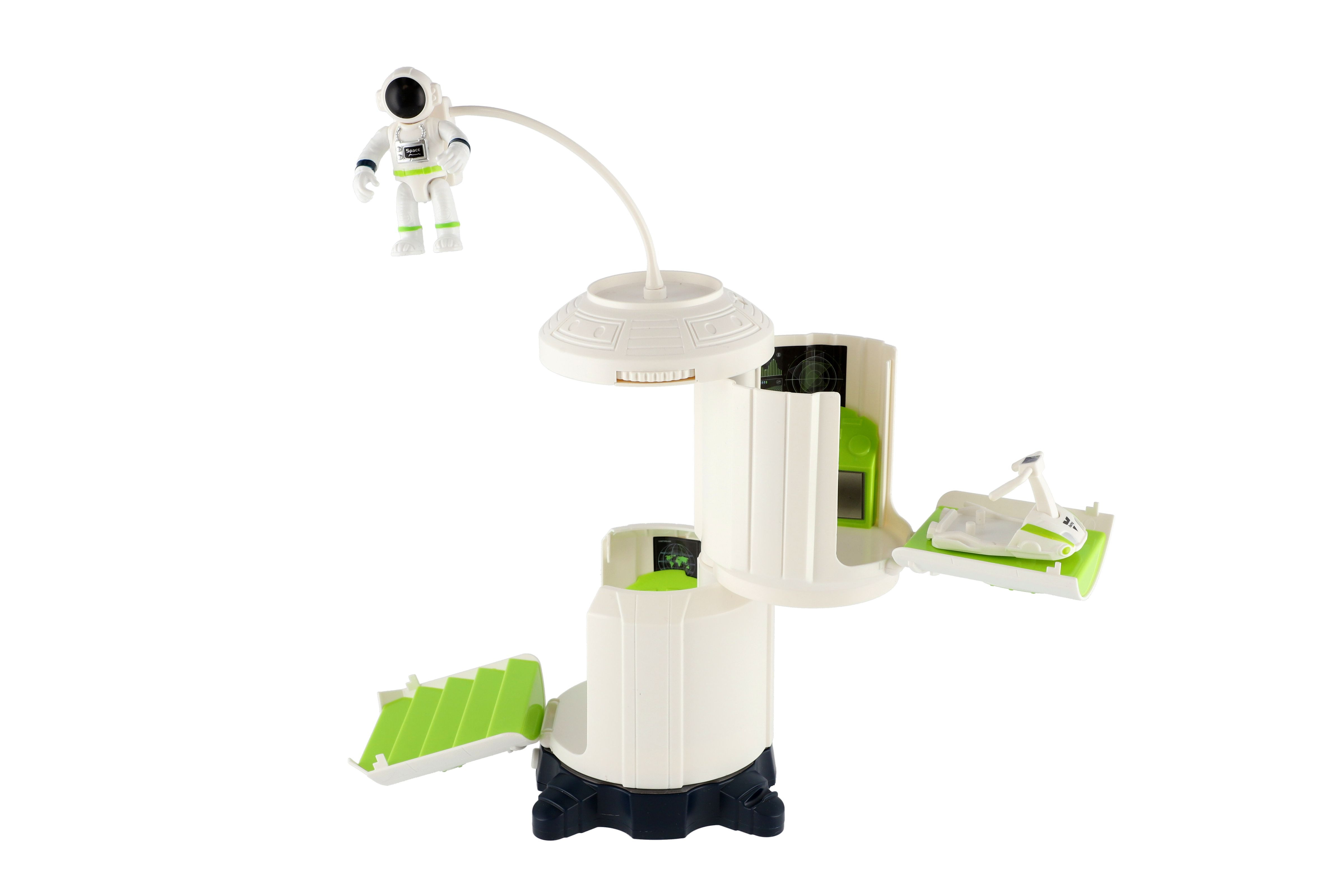 Tak tohle je pořádná stanice, kterou zaručeně musíš mít pro svoje vesmírné akce! Stanice má dvě kontrolní místnosti. S místnostmi můžete otáček jak budete potřebovat. Lze zde i "nabít" vesmírné auto (z jiné sady) nebo zaparkovat vesmírné vznášelo (v balení). Díky vesmírnému lanu na střeše stanice může kosmonaut v bezpečí podniknout vesmírnou procházku. Vesmírná stanice je světlem a zvukem, bude tam plnit realné představy dětí a užíjí si s kosmonauty mnoho zábavy. Na baterie, 2x AA, jsou součástí balení. Rozměry balení: 23 x 30 x 15 cm Vhodné pro děti od 3 let