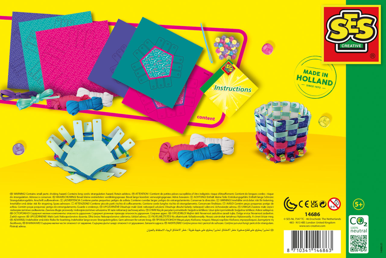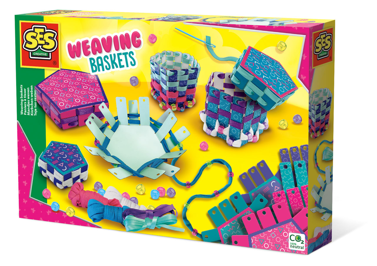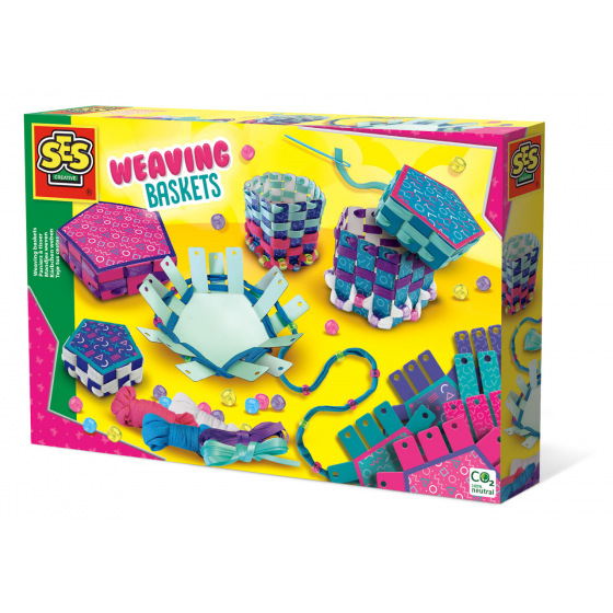 S touto sadou sa ľahko naučte pliesť košíky. Použite papierové košíky ako základ a upleťte tie najkrajšie košíky pomocou bezpečnej plastovej ihly a trojfarebnej priadze. Popustite uzdu svojej kreativite a ozdobte košíky korálkami a saténovými stuhami. Praktické na schovanie vašich malých pokladov. Sada obsahuje: 6 papierových dielov na košíky, 3 priadze z tričkoviny, 2 saténové stuhy, korálky v 4 farbách, plastová ihla. Vek: 5+
