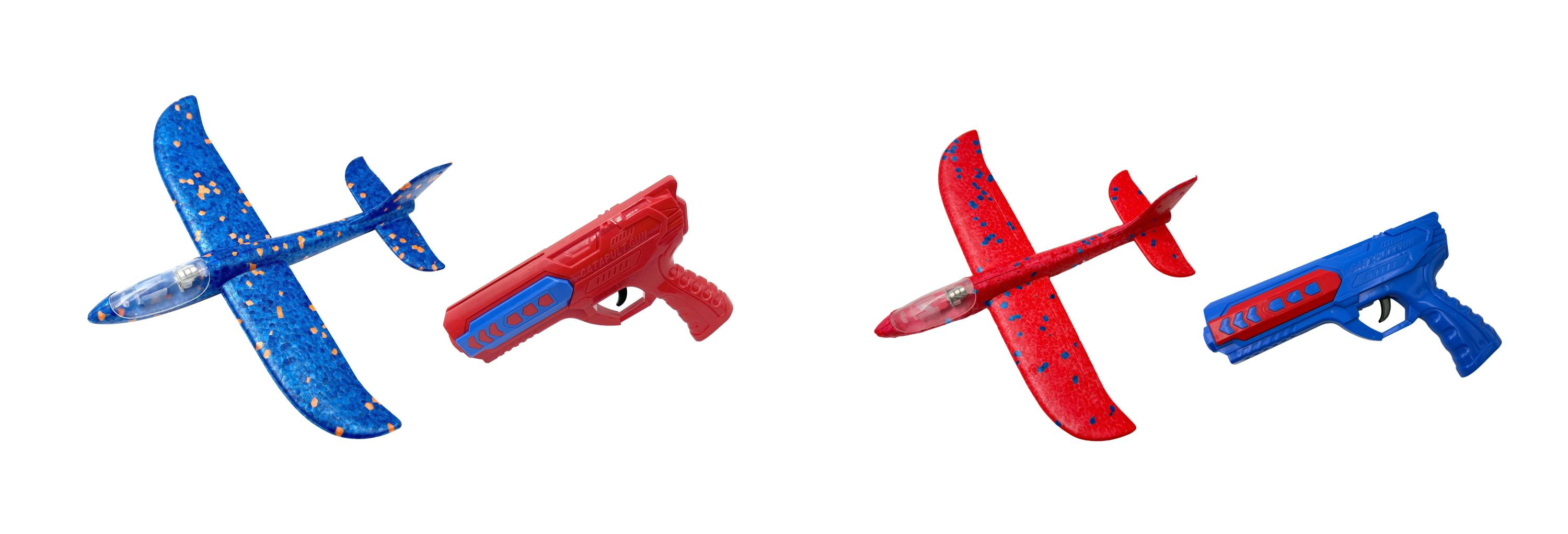 K tomu lietadielka dostaneš aj takú pištoľ. Do tej pištole sa lietadielko vloží a potom ho z nej môžeš vystreliť! Stačí len natiahnuť a stlačiť spúšť a lietadielko poletí vysoko do vzduchu.