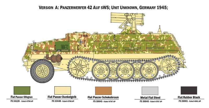 Informácie o originále: Schwerer Wehrmachtschlepper (sWS) bol vyvinutý ako stredný polopásový transportér na prevoz zásob k jednotkám na front a ťažný automobil pre ľahké delá. Na veľký zadný nákladový priestor však boli postupne nasadzované aj ďalšie nadstavby. Jednou z týchto modifikácií bol aj Panzerwerfer 42 auf sWS s desaťhlavňovým 15cm raketometom Nebelwerfer 42 nainštalovaným na obrnený zásobník munície. Tento raketomet bol pôvodne zamýšľaný ako nástroj na vytváranie dymových clôn, čoskoro sa však začal využívať aj ako skutočné delo na odpaľovanie vysoko explozívnej munície. Mohol strieľať rakety s obrovským smrtiacim účinkom. Pôvodná konštrukcia transportného vozidla preto bola vystužená doplnkovými štítmi, ktoré poskytovali posádke lepšiu ochranu pred nepriateľskou paľbou, ale aj negatívnymi účinkami samotného raketometu.
