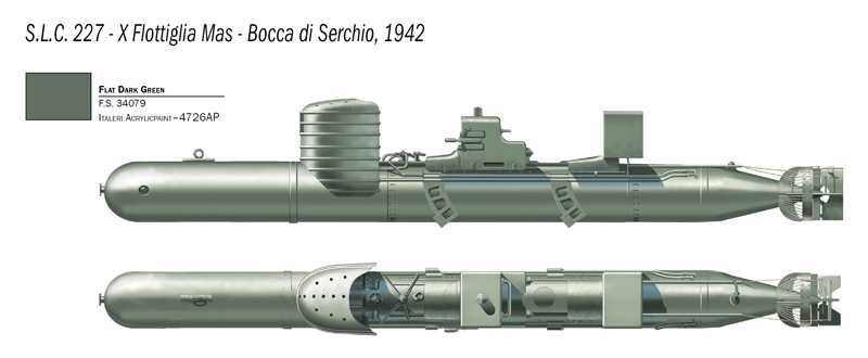Informácie o originále: Na základe skúseností a úspechov talianskej Regia Marina v prvej svetovej vojne. V roku 1935 Teseo Tesei a Elios Toschi vyvinuli a zdokonalili Siluro a Lenta Corsa (SLC), ktorá bola viac neformálne známa ako „Maiale“ (prasa). Išlo o torpédo upravené tak, aby ho mohli pod vodou navádzať dvaja operátori s respirátormi. Mala niesť vysoko výbušnú hlavicu pod kýlom nepriateľských lodí. Upravené torpéda mali obmedzenú rýchlosť, boli vybavené navádzacím systémom a obsahovali batérie, ktoré poháňali elektromotor, ktorý zaručoval dolet 12-15 míľ. pozoruhodná akcia týchto nájazdníkov talianskeho námorníctva sa odohrala 19. decembra 1941. SLC boli transportované ponorkou „Scirè“ do silne bráneného alexandrijského prístavu a boli schopné na niekoľko mesiacov útočiť a zneškodňovať bojové lode Royal Navy HMS: Valiant a the HMS Queen Elizabeth.