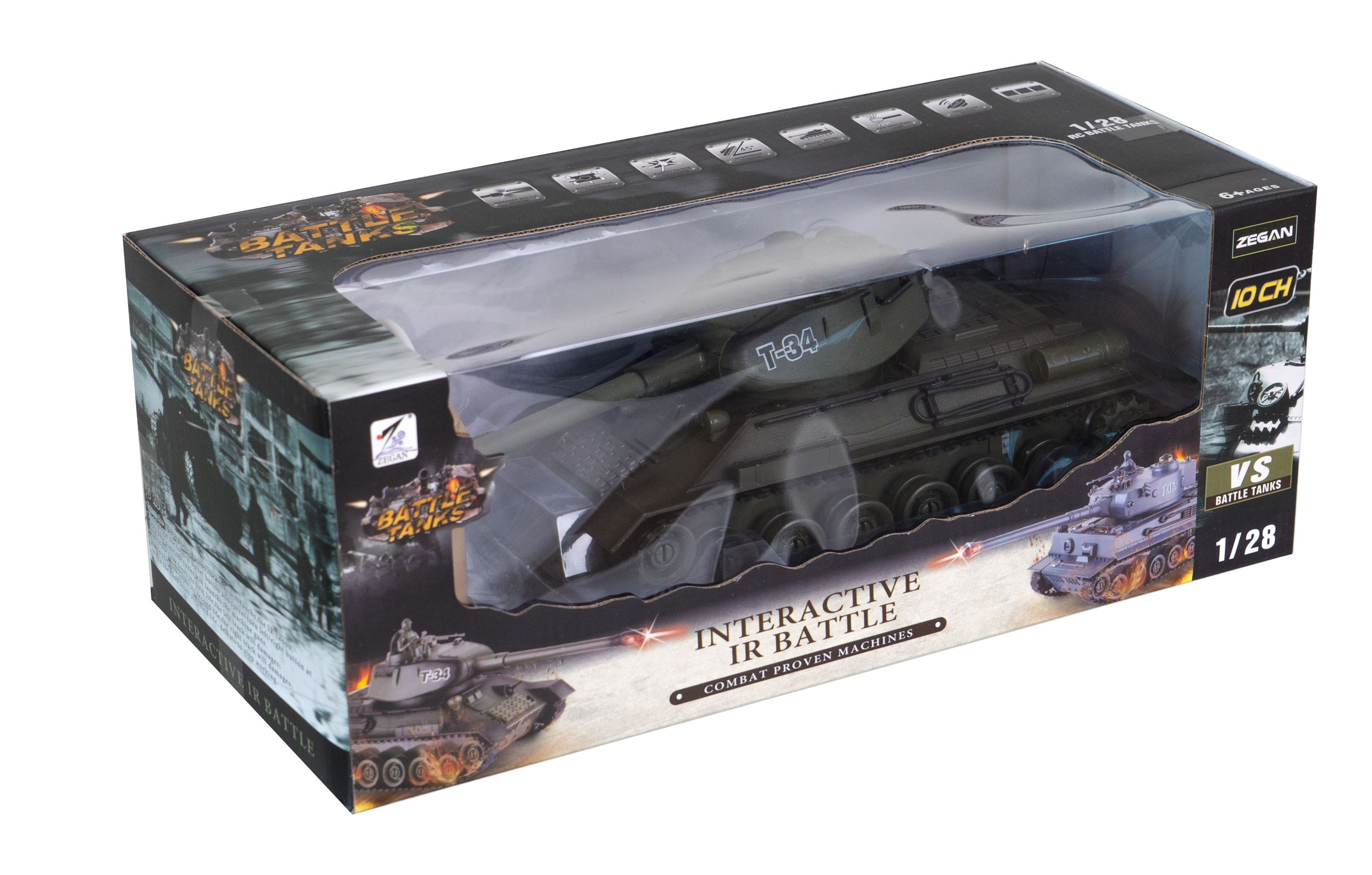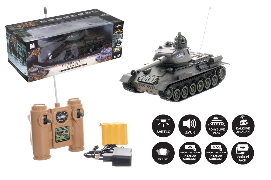 Tank T-34/85 o rozměru 33 cm potěší každého chlapce. Na baterie, s dobíjecím packem, se zvukem a světlem, 27MHz, v krabici. Rozměr krabice 40 x 15 x 19 cm Vhodné od 6 let Při nákupu druhého tanku, např. pro tankovou bitvu, musí být druhý tank na jiné frekvenci. Tzn. pokud máte tank na frekvenci 40 MHz, druhý tank musí být na frekvenci 27 MHz.