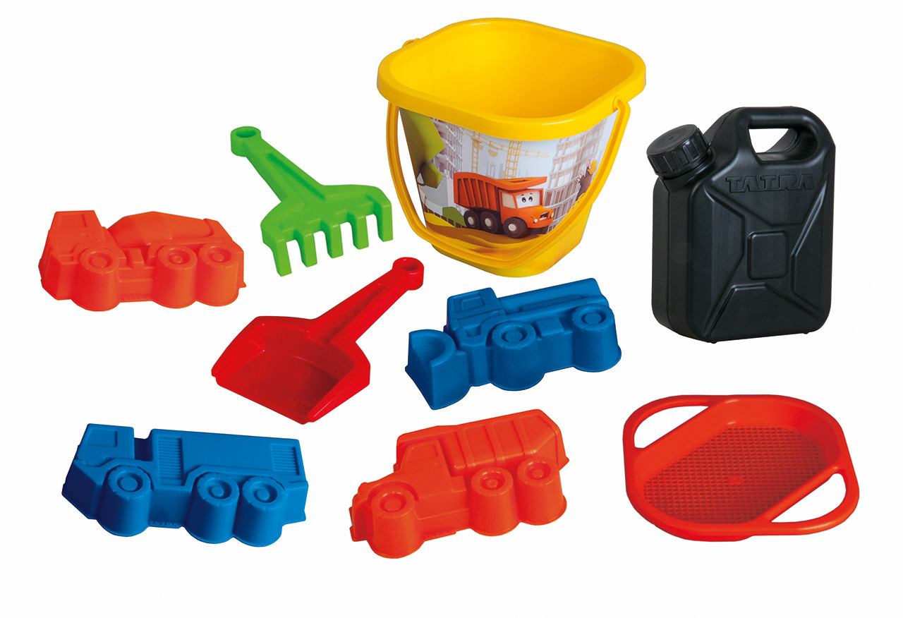 Súprava na piesok obsahuje vedierko so sitkom, lopatku, hrabličky a 15 cm loptu s tatranskými ilustr