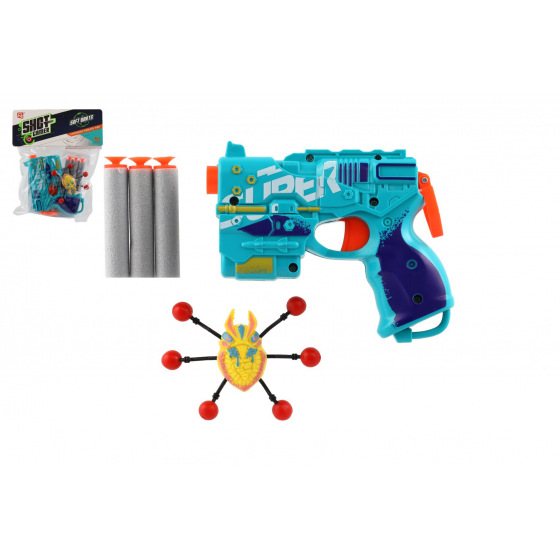 Popis Teddies Pištoľ + penové náboje 3ks s prísavkami plast / pena + mimozemšťan lezúci po skle v sáčku 18x22x4cm