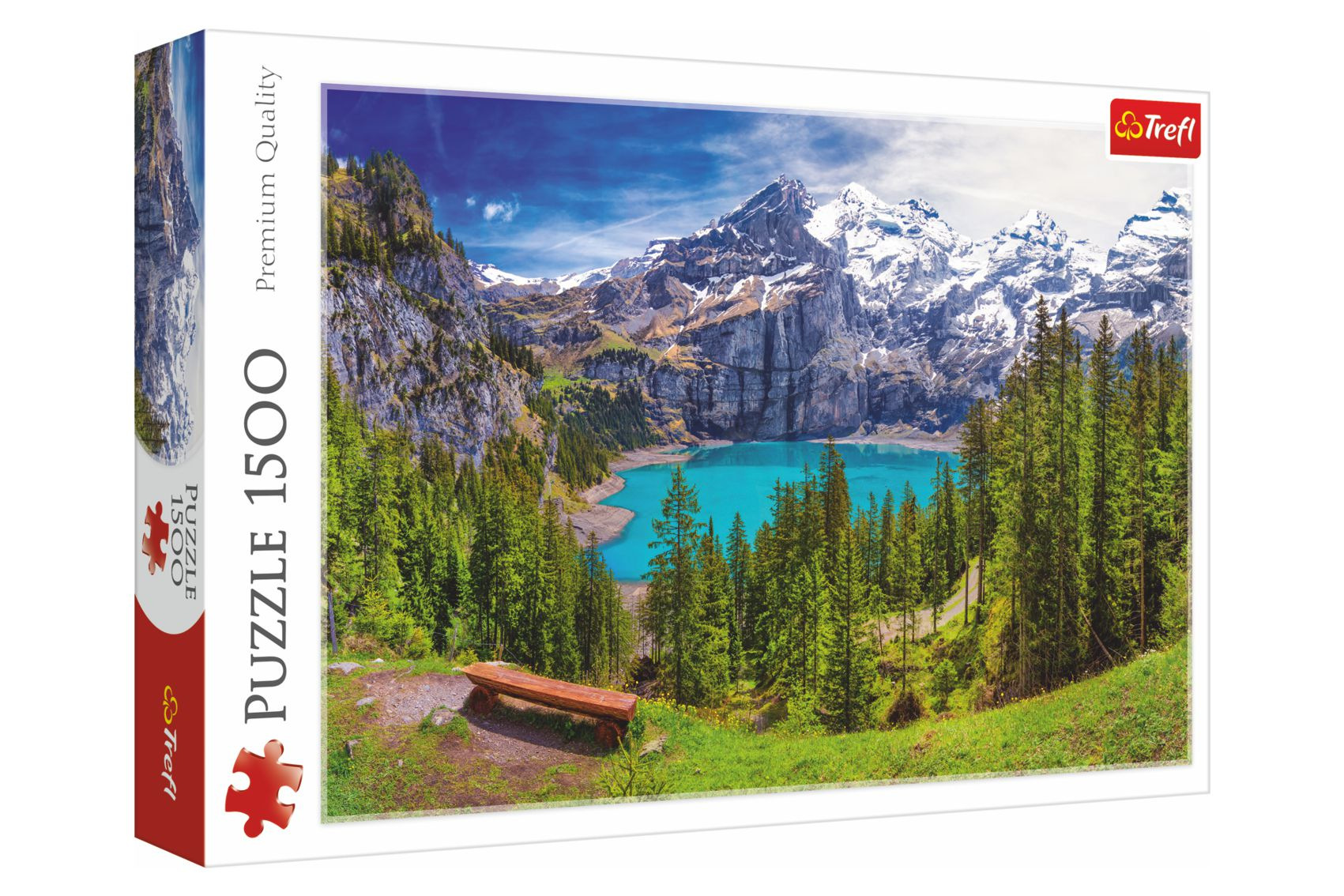 Popis Trefl Puzzle Jazero Oeschinen Alpy, Švajčiarsko 1500 dielikov 85x58cm v krabici 40x26x6cm