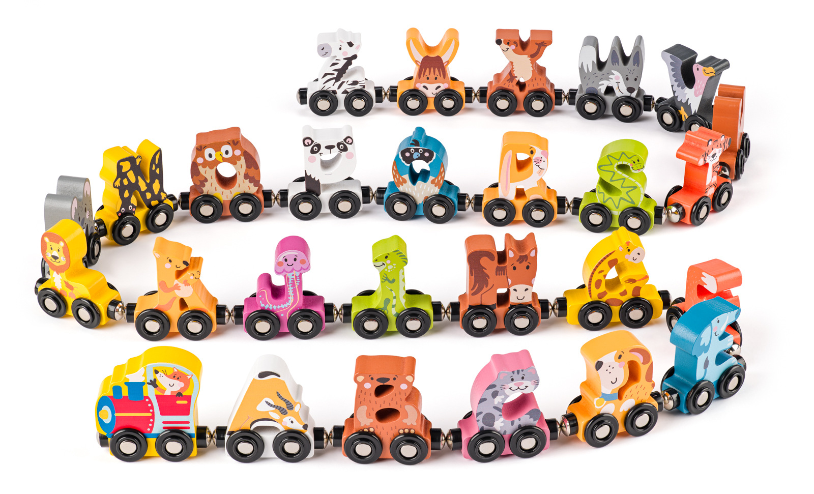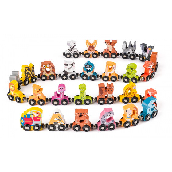 Tento barevný dřevěný vláček s abecedou potěší všechny malé objevitele písmenek i zvířat. Sada obsahuje 27 dílů – lokomotivu a vagonky ve tvaru písmen, které jsou spojeny klasickými magnety. Každé písmeno má podobu zvířátka a na druhé straně jeho anglický název, takže si děti při hře nenápadně osvojují základy angličtiny. Děti si navíc mohou hravě skládat jednotlivá písmena do slov, rozvíjet tak svou kreativitu a učit se číst. Abeceda je krásně barevná, hravá a originální – její jedinečný design pochází od české autorky. Ideální hračka pro rozvoj fantazie, jemné motoriky i jazykových dovedností. Rozměry jednoho vagonku cca: 6,3 x 6,5 x 2,5 cm. Celková délka vláčku: 179 cm. Rozměry balení: 32 x 47 x 37,5 cm. Věk: 3+