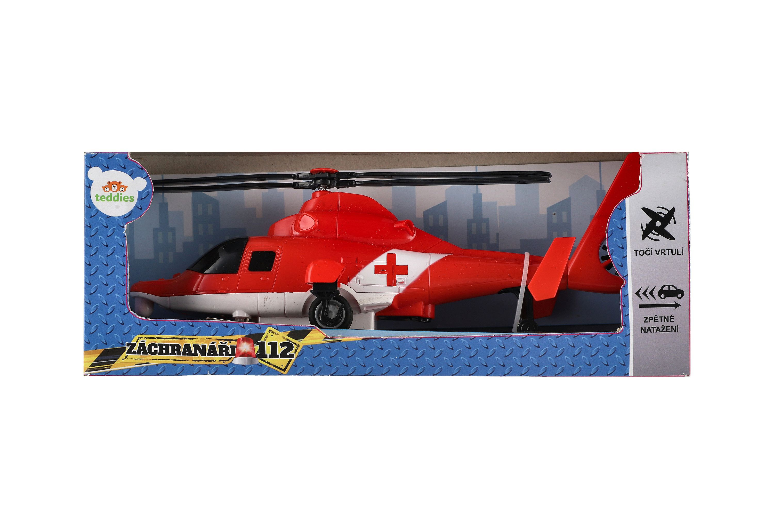 Popis Teddies Vrtuľník/Helikoptéra záchrannej služby plast 22cm na spätné natiahnutie v krabičke 25x9x6,5cm