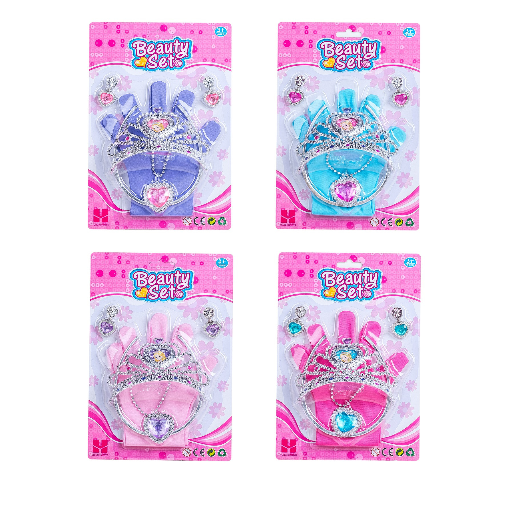 Šperky a rukavičky sada doplňků. Korunka 12,5 cm. Obsah balení - rukavičky, korunka, čelenka, náhrdelník, 2 náušnice. 4 varianty - modrá, fialová, růžová, červená.