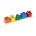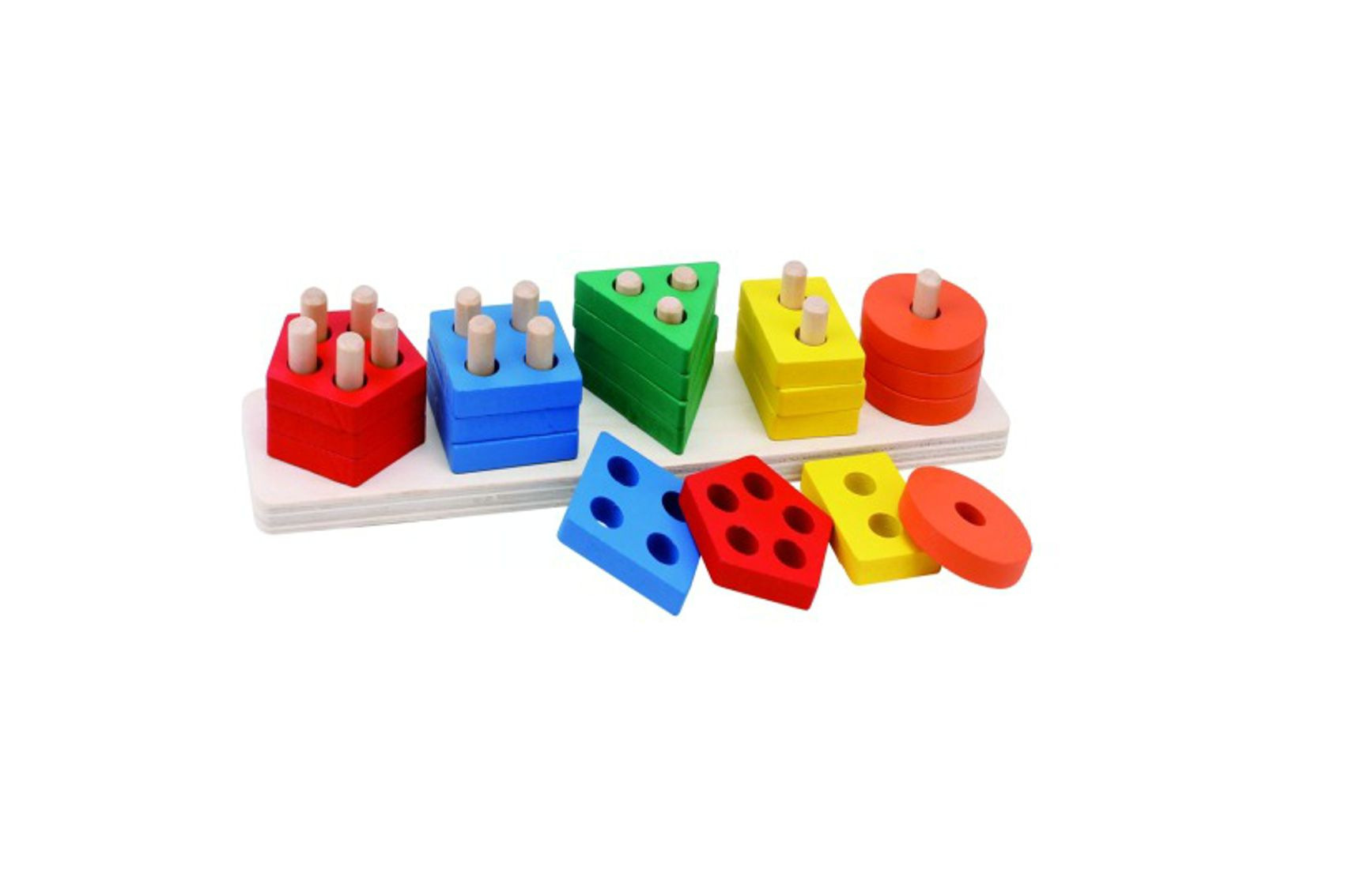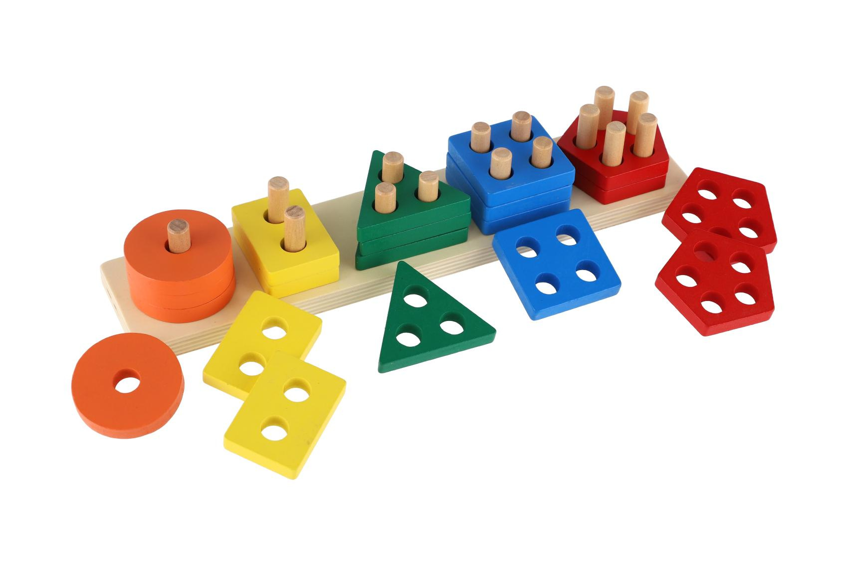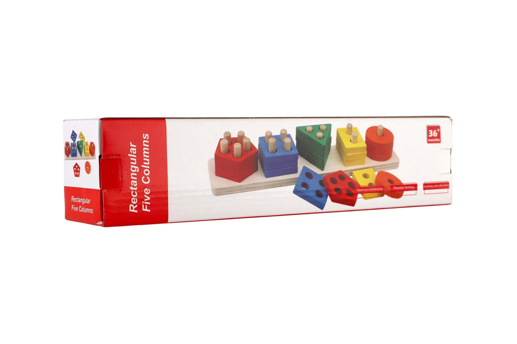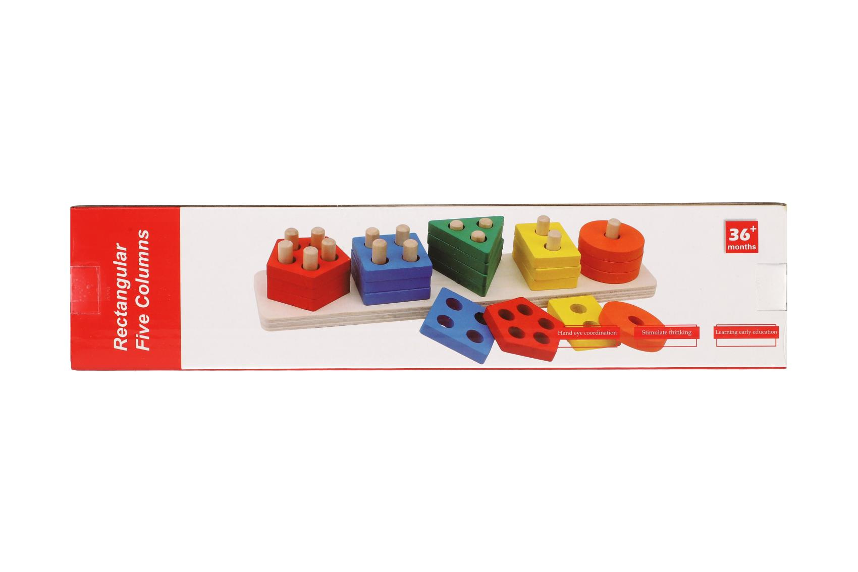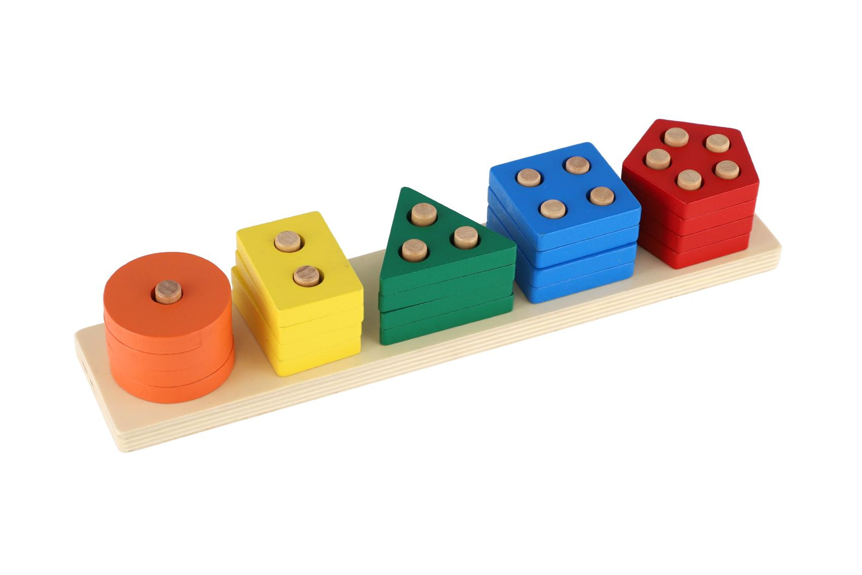 Barevná dřevěná vzdělávací hračka, která rozvíjí jemnou motoriku, logické myšlení a schopnost rozlišovat tvary a barvy. Na dřevěné podložce je pět sloupků, na které se navlékají dílky různých tvarů – kruh, obdélník, trojúhelník, čtverec a pětiúhelník. Každý tvar má jiný počet otvorů, což pomáhá dětem při učení počítání a koordinace oko–ruka. Vhodné pro děti od 3 let
