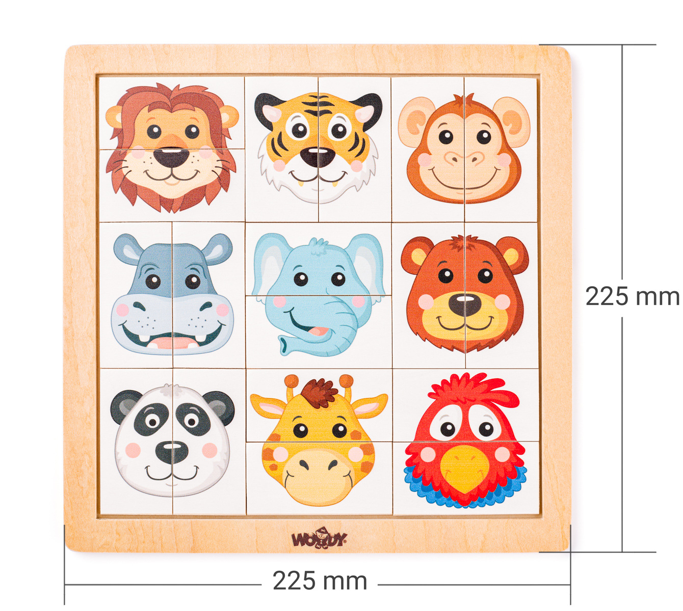 Hlavičky zvířátek jsou přičně i podélně rozděleny na dvě části. Úkolem dítěte je složit je správně nebo vytvořit své vlastní "zvíře k nevíře" | Věk: 2+ | Rozměr: 22,5 x 22,5 x 1 cm|
