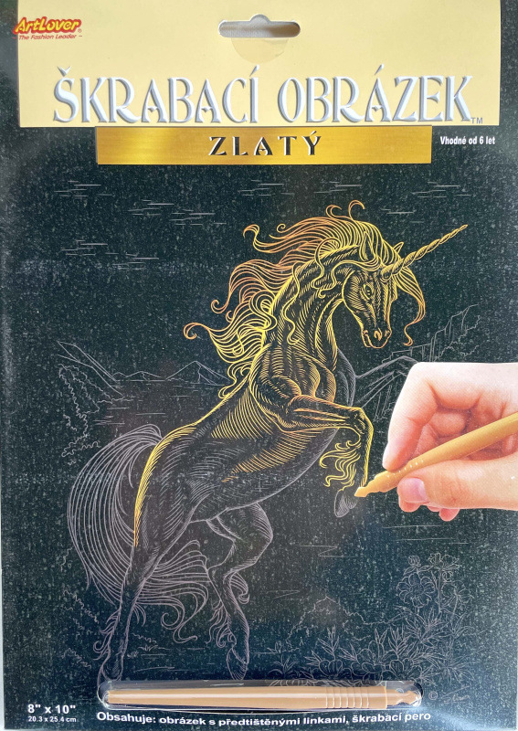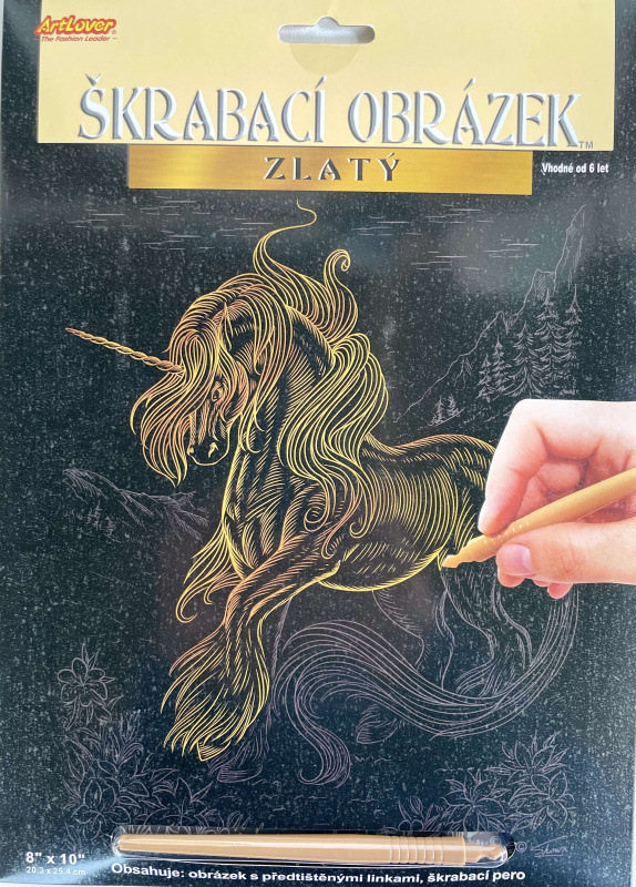 Škrabací obrázek pro všechny milovníky jednorožců. Seškrabte pomocí umělohmotného škrabacího pera linky předtištěného jednorožce, aby Vám vznikl krásný zlatý obrázek. Velikost obrázku: 20,3 x 25,4 cm Vhodné pro děti od 6 let