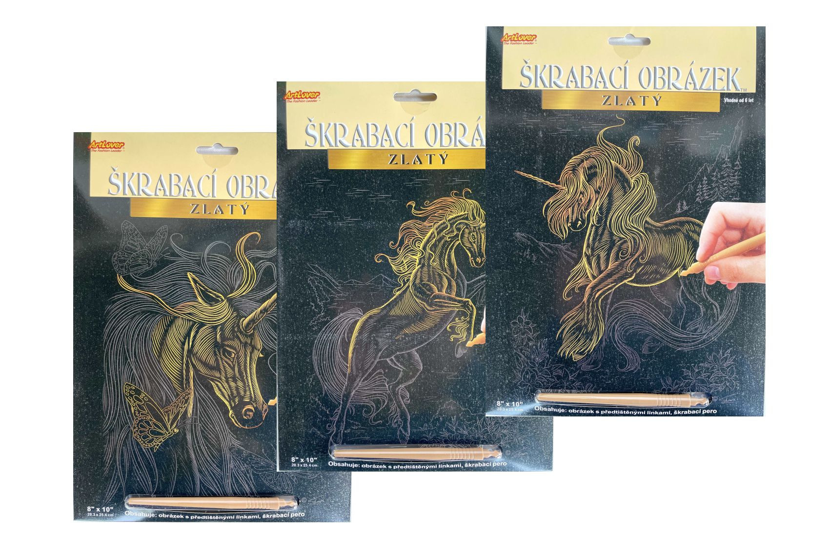 Popis SMT Creatoys Škrabací obrázek zlatý Jednorožec A4 20,3x25,4cm 3 druhy na kartě