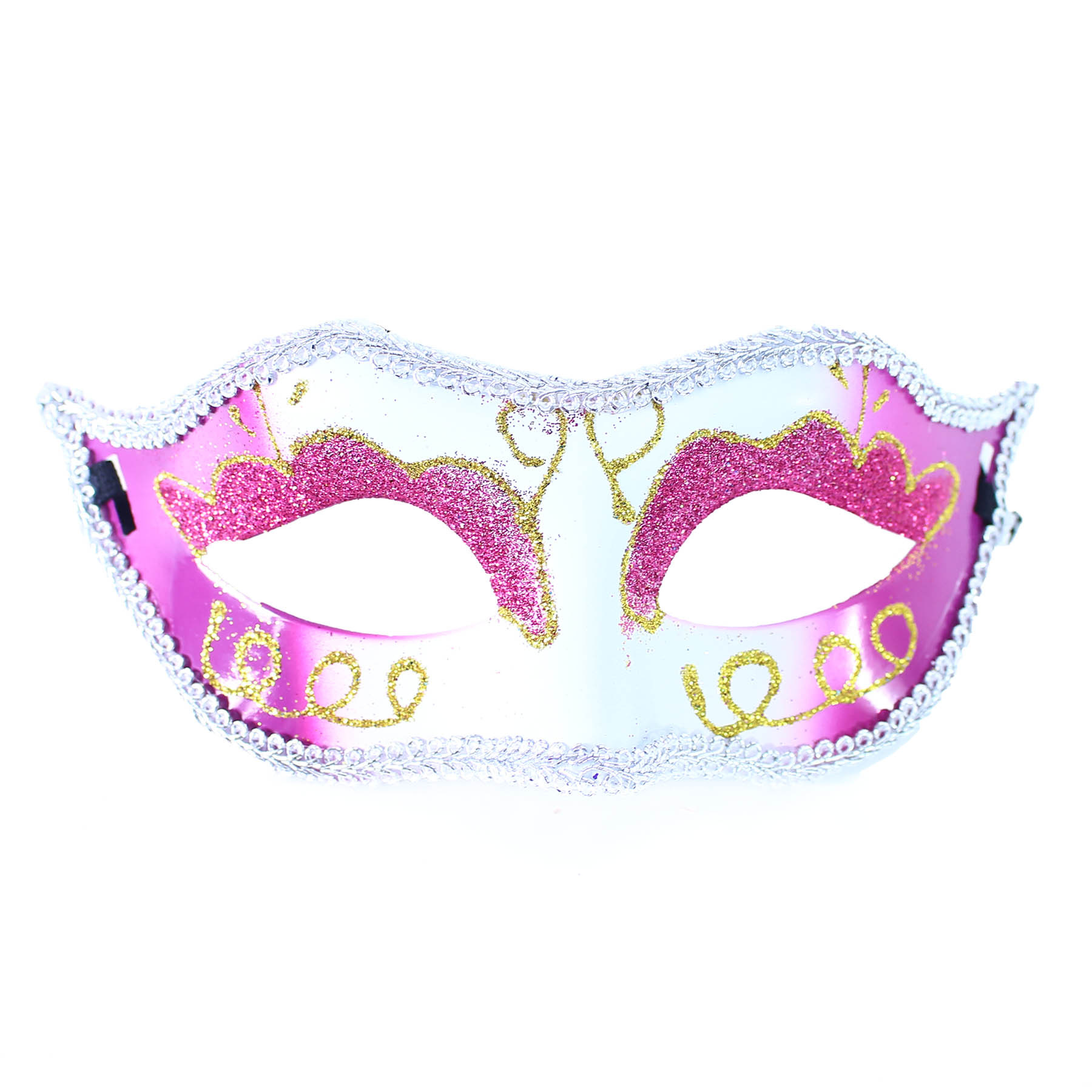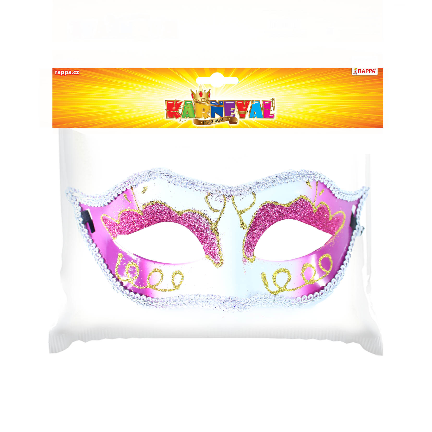 Růžovo-bílá elegantní škraboška na gumičku! Tento kousek je dekorován třpytivými malůvkami a lemován