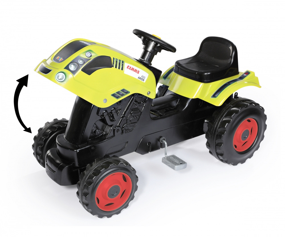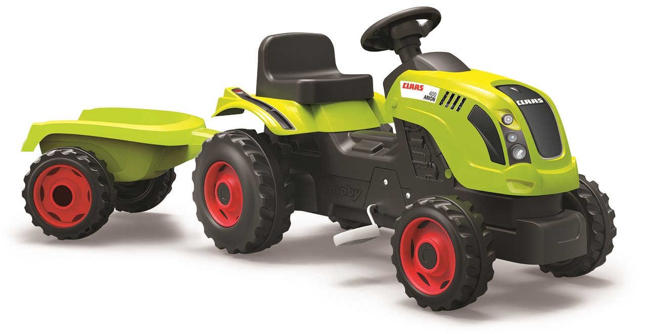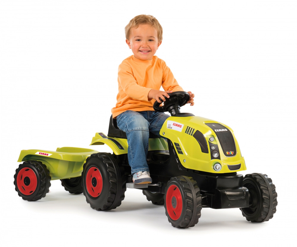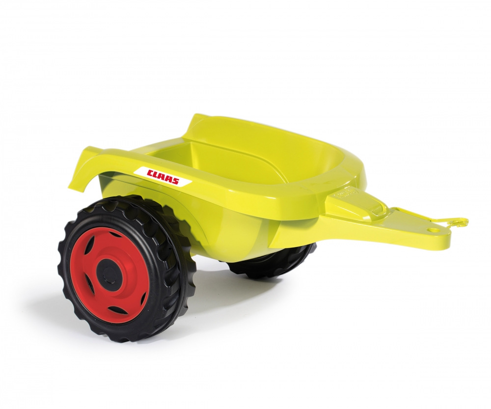 Šlapací traktor CLAAS s volantem a přívěsným vozíkem, který lze odpojit. Odklápěcí kryt motoru. Nastavitelné sedadlo dle výšky dítěte. Klakson na volantu. Vyrobeno z velmi kvalitního plastu. Rozměry vč. vozíku: 142 x 54,5 x 44 cm. Délka traktoru bez vozíku cca 80 cm. Hmotnost 6,3 kg.Více
