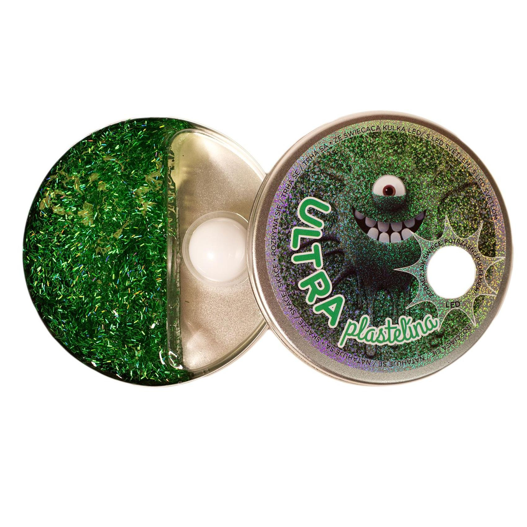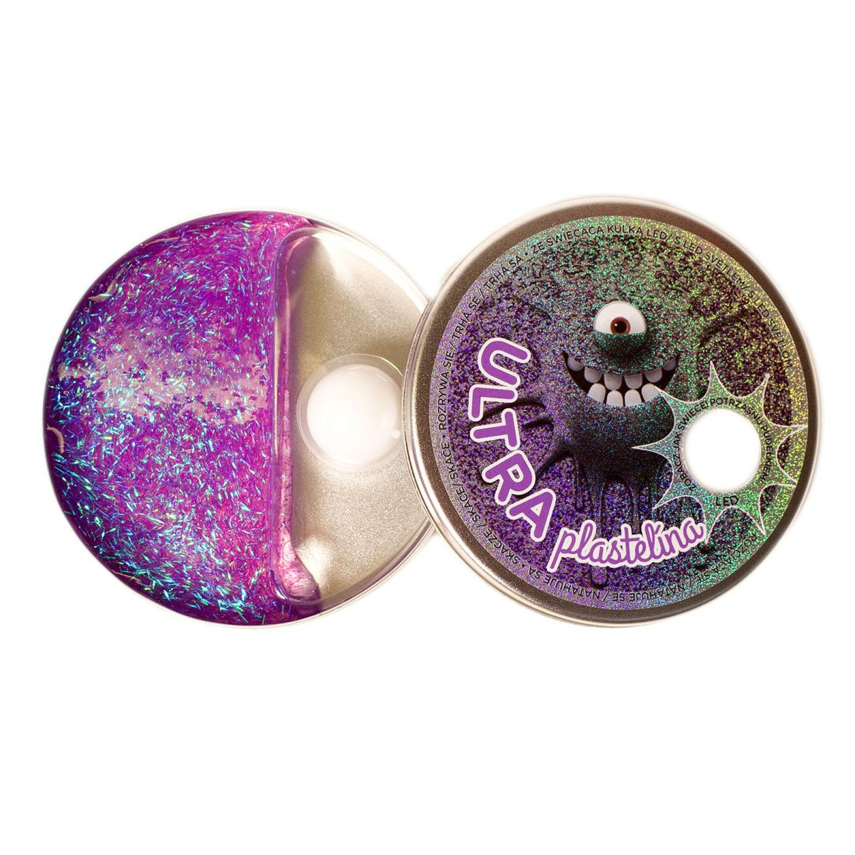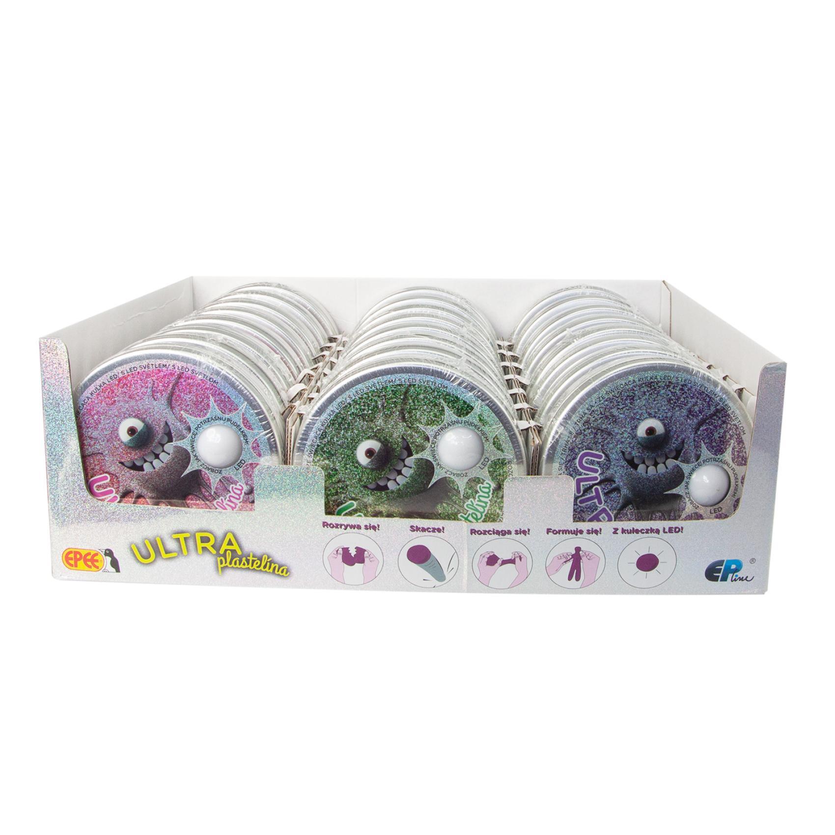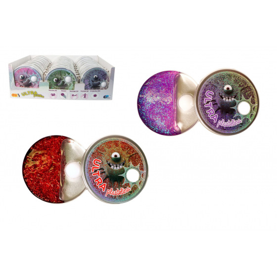 Sliz - hmota Ultra plastelína se svítící kuličkou LED 80g mix barev v plechové krabičce 24ks v boxu