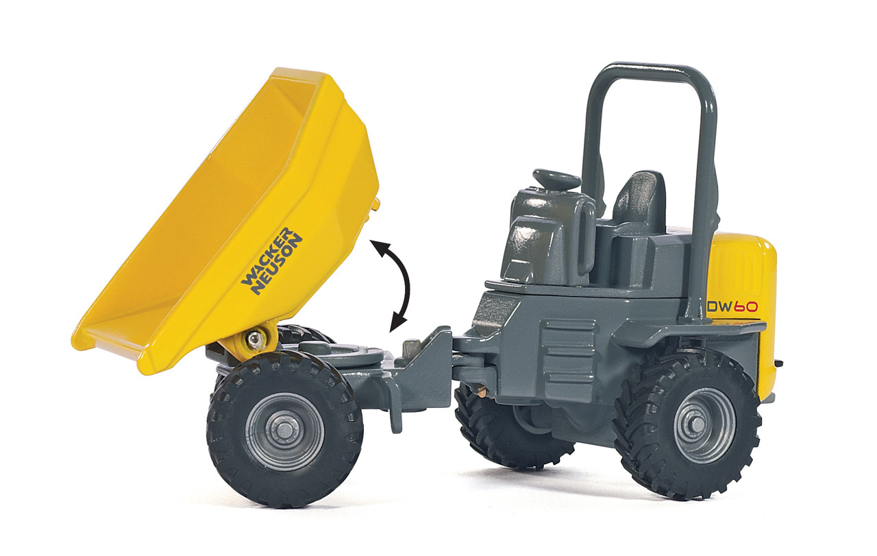 Wacker Neuson DW 60 Dumper je detailně propracovaná kopie v měřítku 1:50. Nový DW 60 od Wacker-Neuson je sklápěč vhodný na všechny povrchy malých a středních stavenišť. Pomocí kloubového spoje ve středu vozidla, je sklápěč schopen mnoha manévrovacích pohybů v těch nejmenších prostorech. Charakteristický rys tohoto modelu je jeho kovový sklápěč, který jde současně sklopit a otočit o 180 stupňů. Díky hlubokému vzorku pneumatiky, vyrobeného z pogumovaného materiálu, drží pevně, a to i na nerovných površích. Rozměr: 106 x 47 x 68 mm. Rozměr balení: 8,7 x 15,5 x 5,9 cm. Věk: 3+