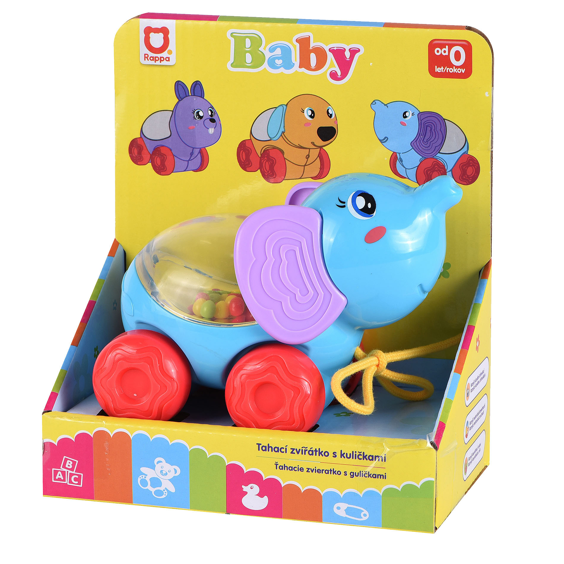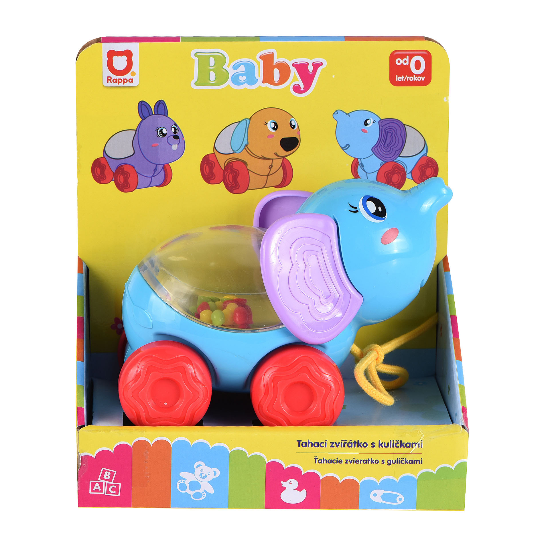 Veselé zvířátko slon na kolečkách s barevnými kuličkami. Taháním či pohybem zvířátka začnou kuličky uvnitř poskakovat. Tato hračka zaujme a pobaví i ty nejmenší děti.