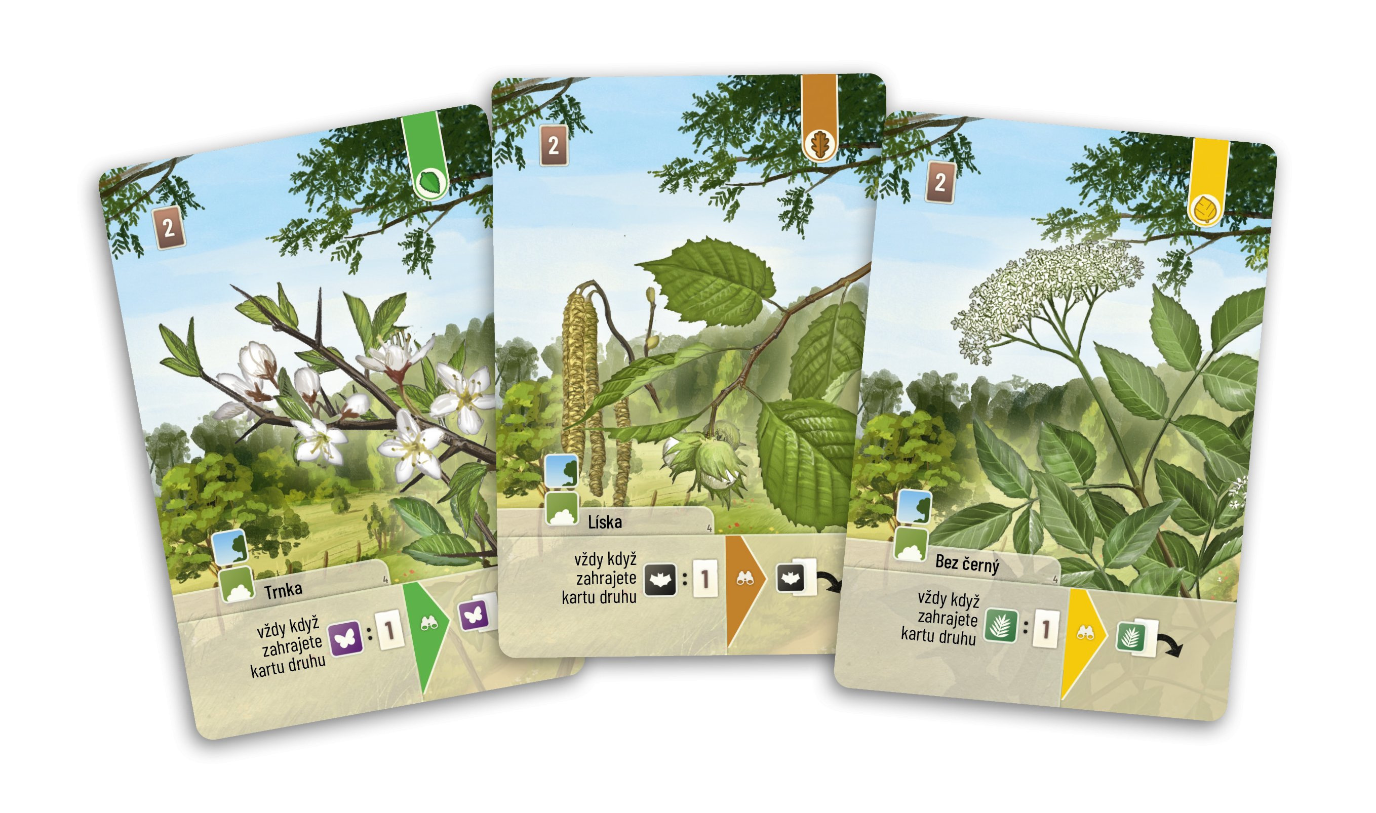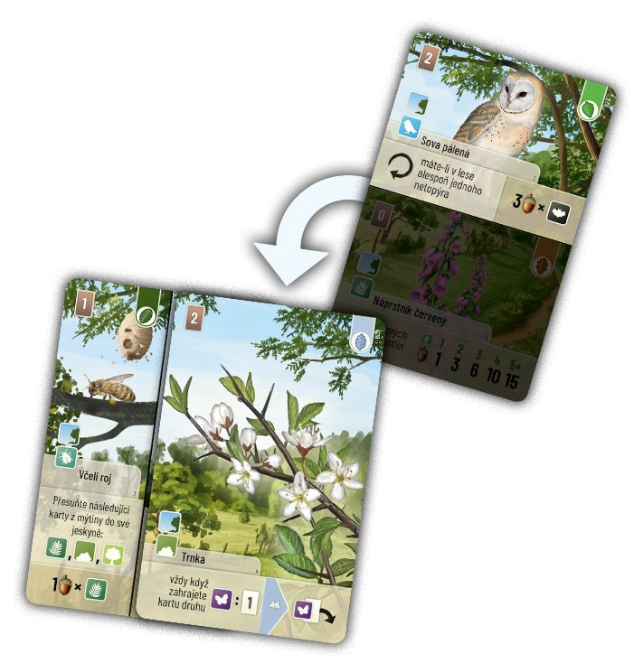 Co je nového? - Keře. Nabízejí místo pro jednu kartu na každé ze svých čtyř stran (jako stromy) a také mají trvalý efekt (jako houby). - Efekt/bonus dobírání karet z mýtiny
