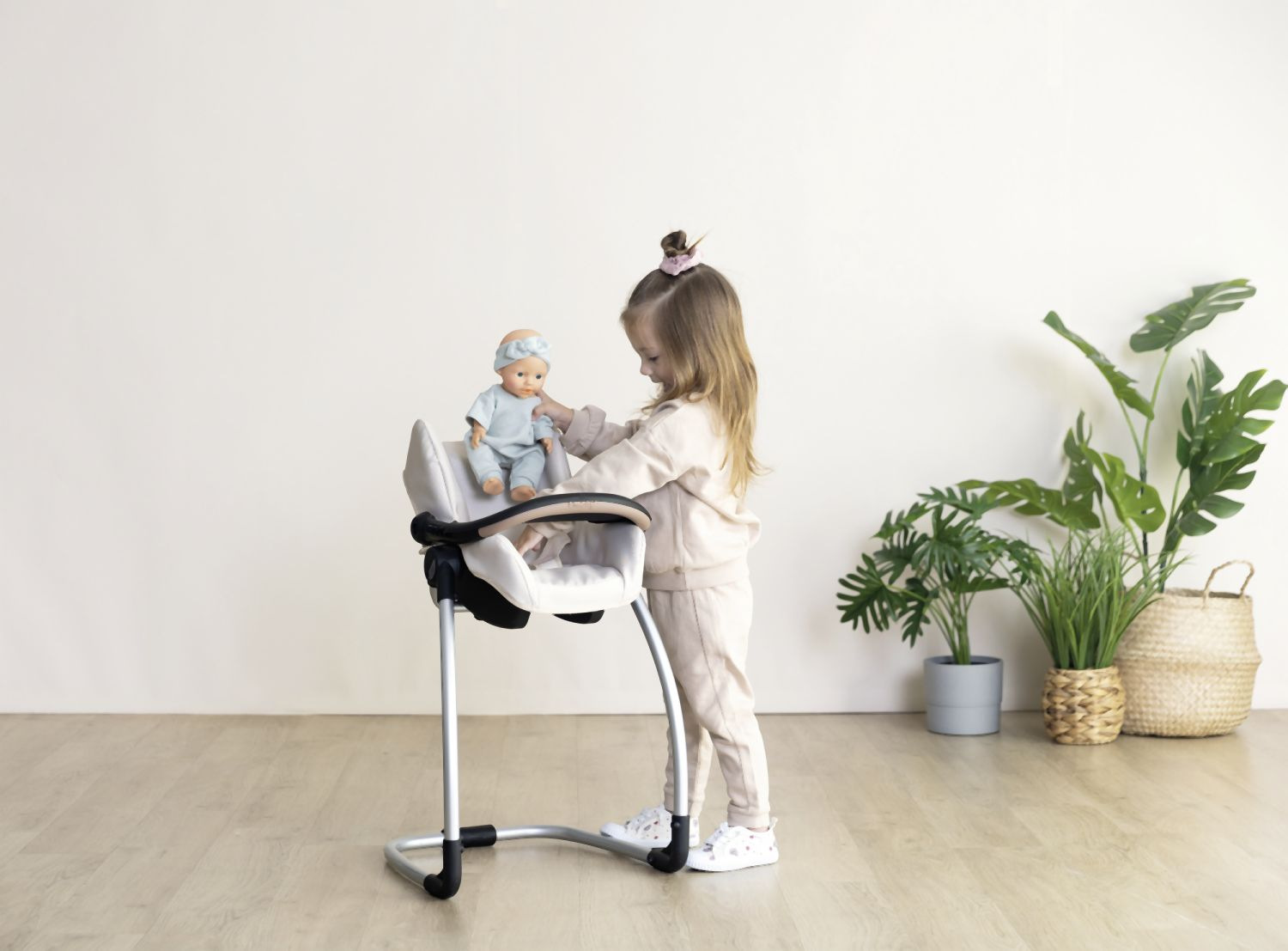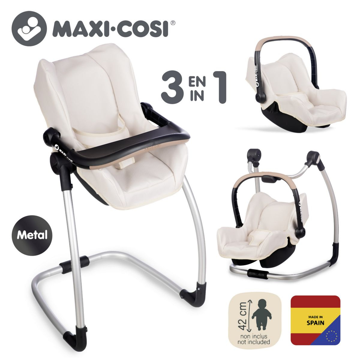 Autosedačka Maxi-Cosi 3 v 1 pro panenky. Při zavěšení sedačky na konstrukci je rázem houpačka pro panenku do velikosti 42 cm. Otočením konstrukce získáte vysokou jídelní židličku s pultíkem. Rozměry (DxŠxV): 43 x 41 x 72 cm.