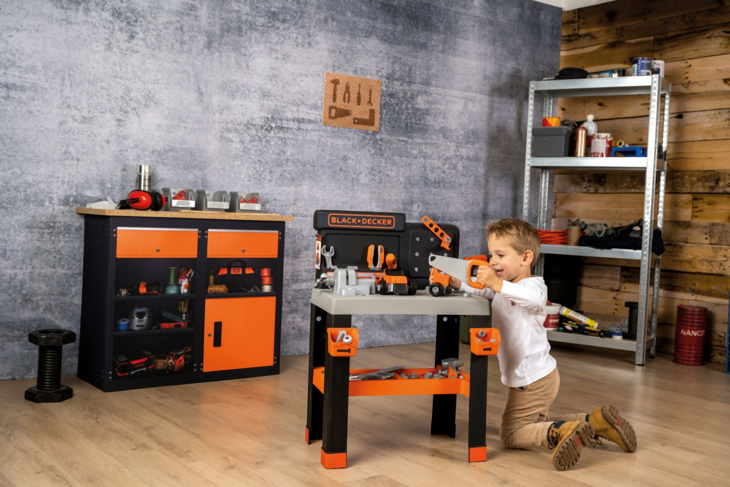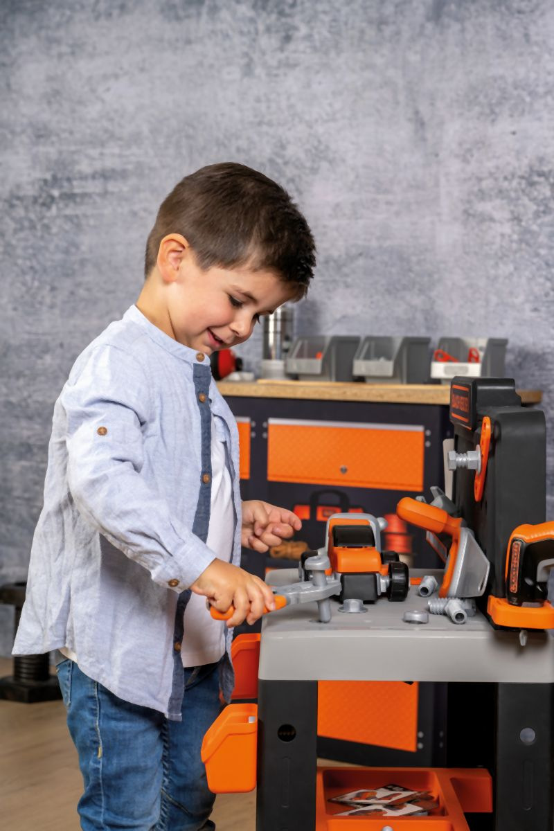 Realistické centrum pracovního stolu Smoby Black+Decker s 83 díly příslušenství , 7 nástroji a vozidlem . Velký, robustní pracovní stůl vypadá jako skutečný tátův pracovní stůl. Velká pracovní plocha v dřevěném designu nabízí dostatek prostoru pro různé nářadí. Mechanickým akumulátorovým šroubovákem lze ze stavebních bloků sešroubovat různá vozidla. Vybavení je doplněno šroubovou svorkou a posuvným pravítkem. Spousta úložných přihrádek na šrouby a hřebíky. Se zábavnou zatloukací funkcí hřebíků. Tento výrobek obsahuje minimálně 65 % recyklovaného materiálu. Rozměry produktu (DxŠxV): 36 x 57,5 x 75 cm.