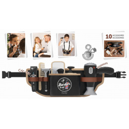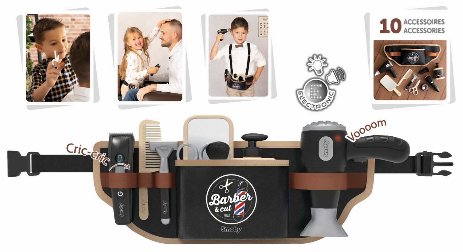 Nastavitelný holičský pás s 10 doplňky. Textilní pásek s nastavitelnou velikostí lze perfektně nastavit a snadno se nasazuje pomocí klipu vhodného pro děti. Gumičky drží deset doplňků: nůžky, mechanický zastřihovač vousů, pleťová voda, holicí strojek, zrcátko, elektronický fén se zvukem, mýdlo na ruce, hřeben a štětka na holení. Rozměry (DxŠxV): 38 x 4 x 14,5 cm.