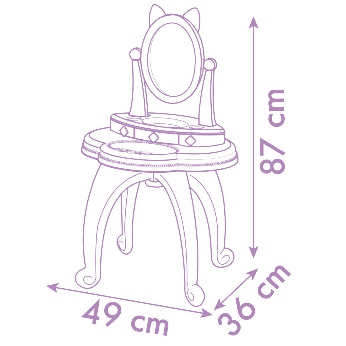 Toaletní stolek v designu Gabby´s Dollhouse se třpytivým efektem pro malé parádnice. Více než 10 ks příslušenství (např. čelenka, hřeben, prstýnky, lak na nehty, rtěnka atd.). Součástí nastavitelné zrcátko a židlička, nosnost židličky 50 kg. Toaletní stolek lze oddělit od nohou a postavit na stůl. Rozměry: 49 x 94 x 36 cm. Hmotnost 2,36 kg.