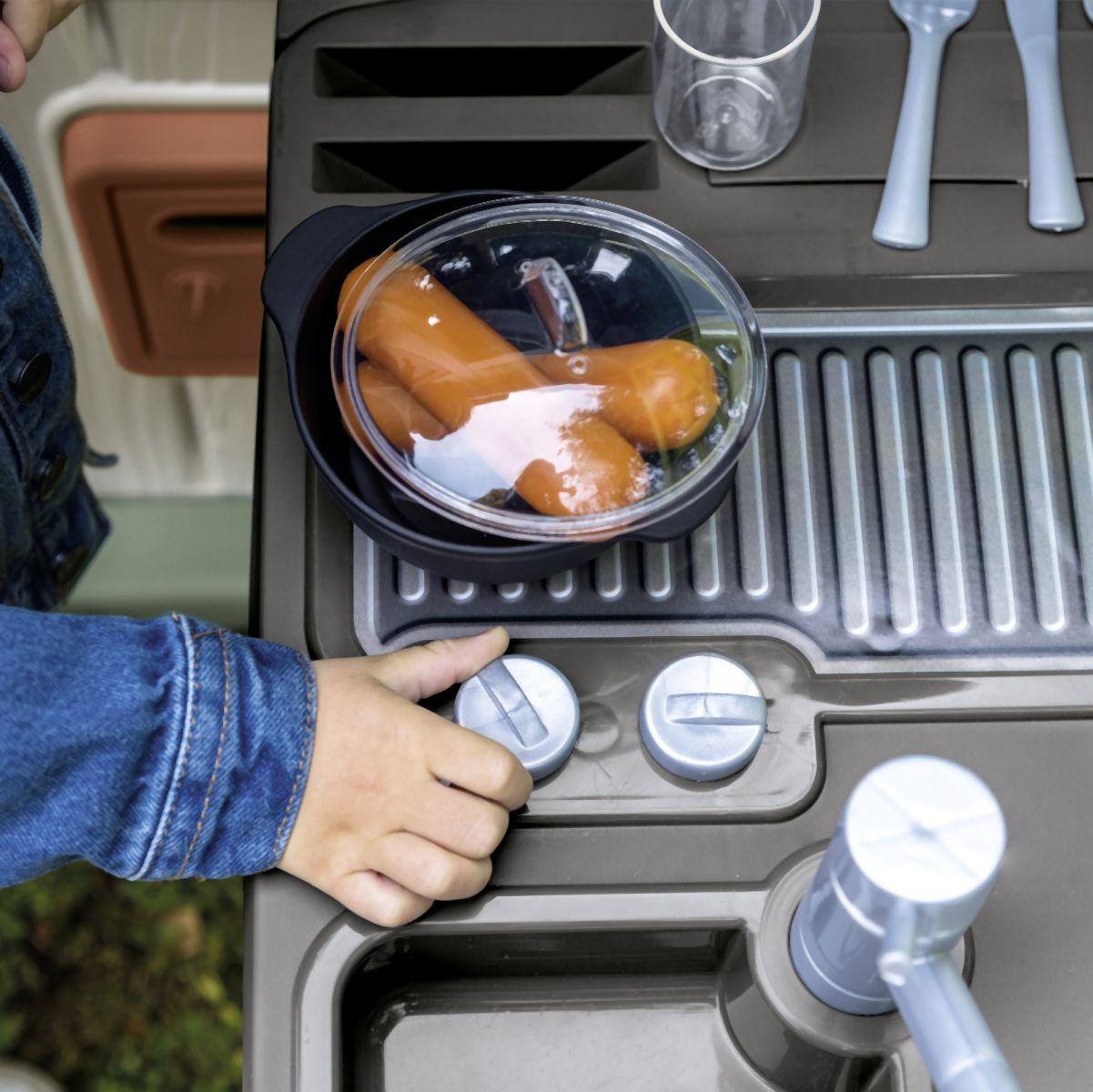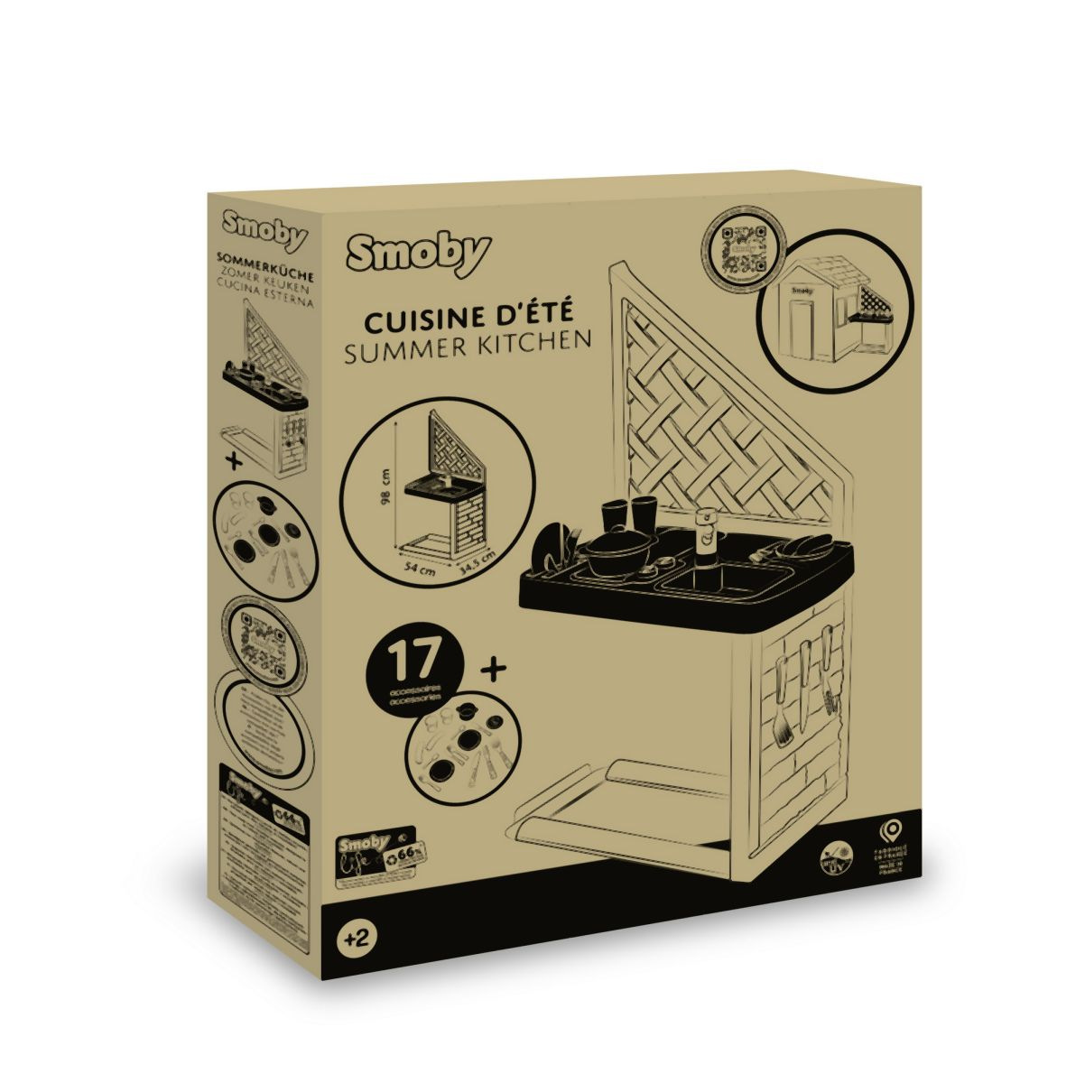 Letní kuchyňka jako doplněk pro domeček Neo Jura Lodge,Pretty, Nature, My Neo House, Neo Friends House, Chef, Boss House, My New house, Green Jura Lodge a Green Evo Friends House. Skládá se z grilu a umyvadla s kohoutkem. Obsahuje 17 doplňků - 2 sklenice, 2 talíře, 2 klobásy, hrnec s pokličkou a příbory. Anti-UV ošetření zaručuje dobrou odolnost a trvanlivost barev. Tento výrobek obsahuje minimálně 66 % recyklovaného materiálu. Rozměry produktu (DxŠxV): 54 x 34,5 x 98 cm.