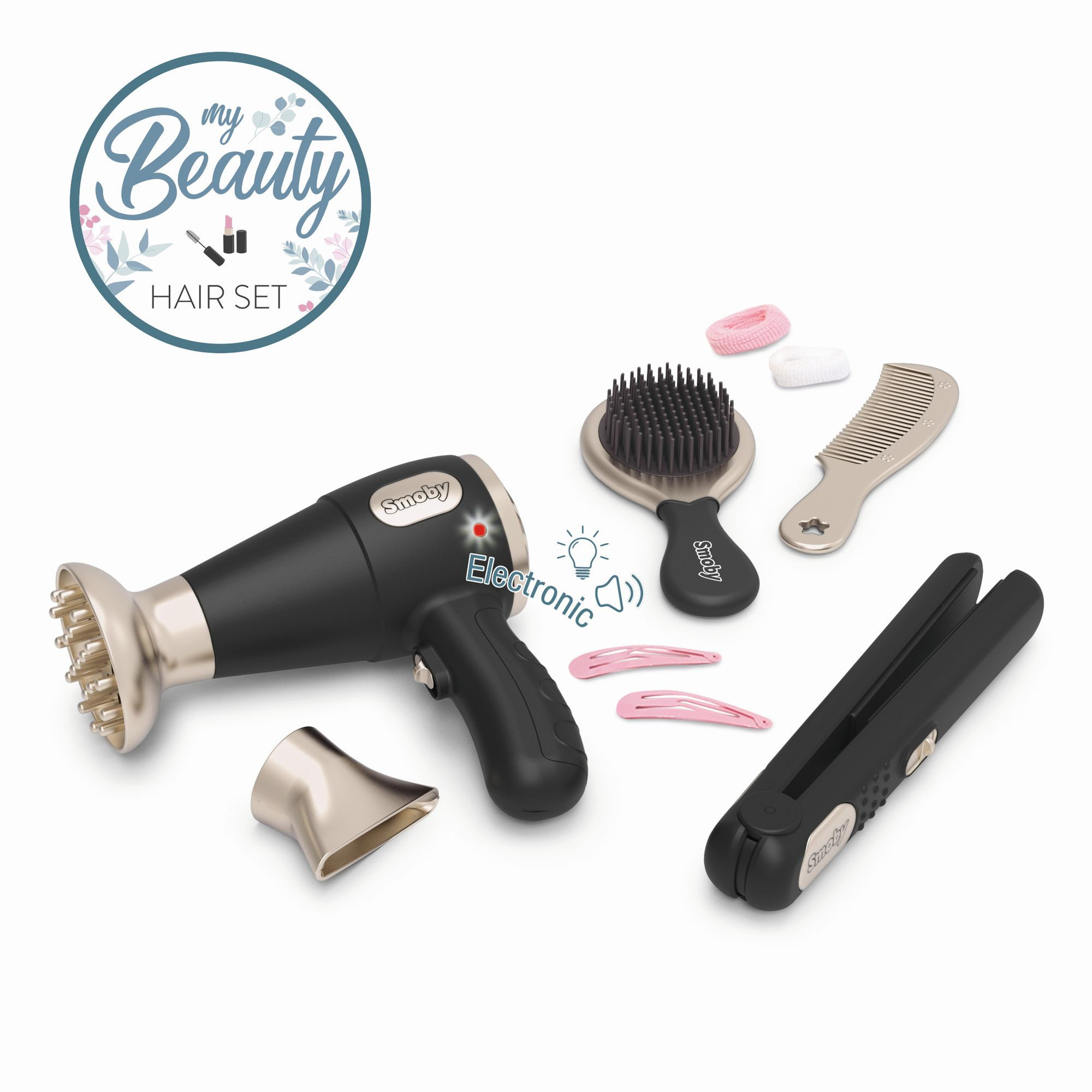 Kadeřnická sada My Beauty s fénem a příslušenstvím. Veškeré příslušenství je realisticky navrženo, fén po stisknutí tlačítka vydává zvuk a rozsvítí se kontrolka, stejně jako ve skutečnosti! Sada obsahuje fén se světelnou a zvukovou funkcí, má 2 nástavce. Součástí také žehlička na vlasy, kartáč, hřeben a sponky a gumičky do vlasů. Rozměry fénu: 14 x 2,5 cm.