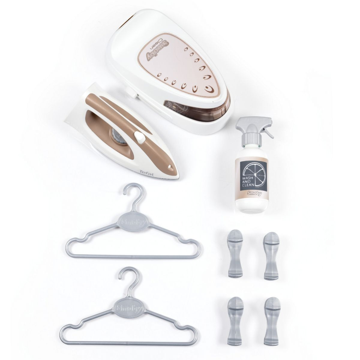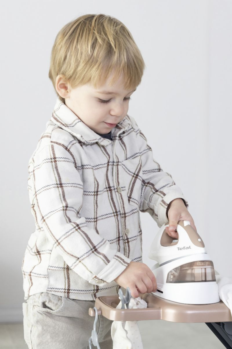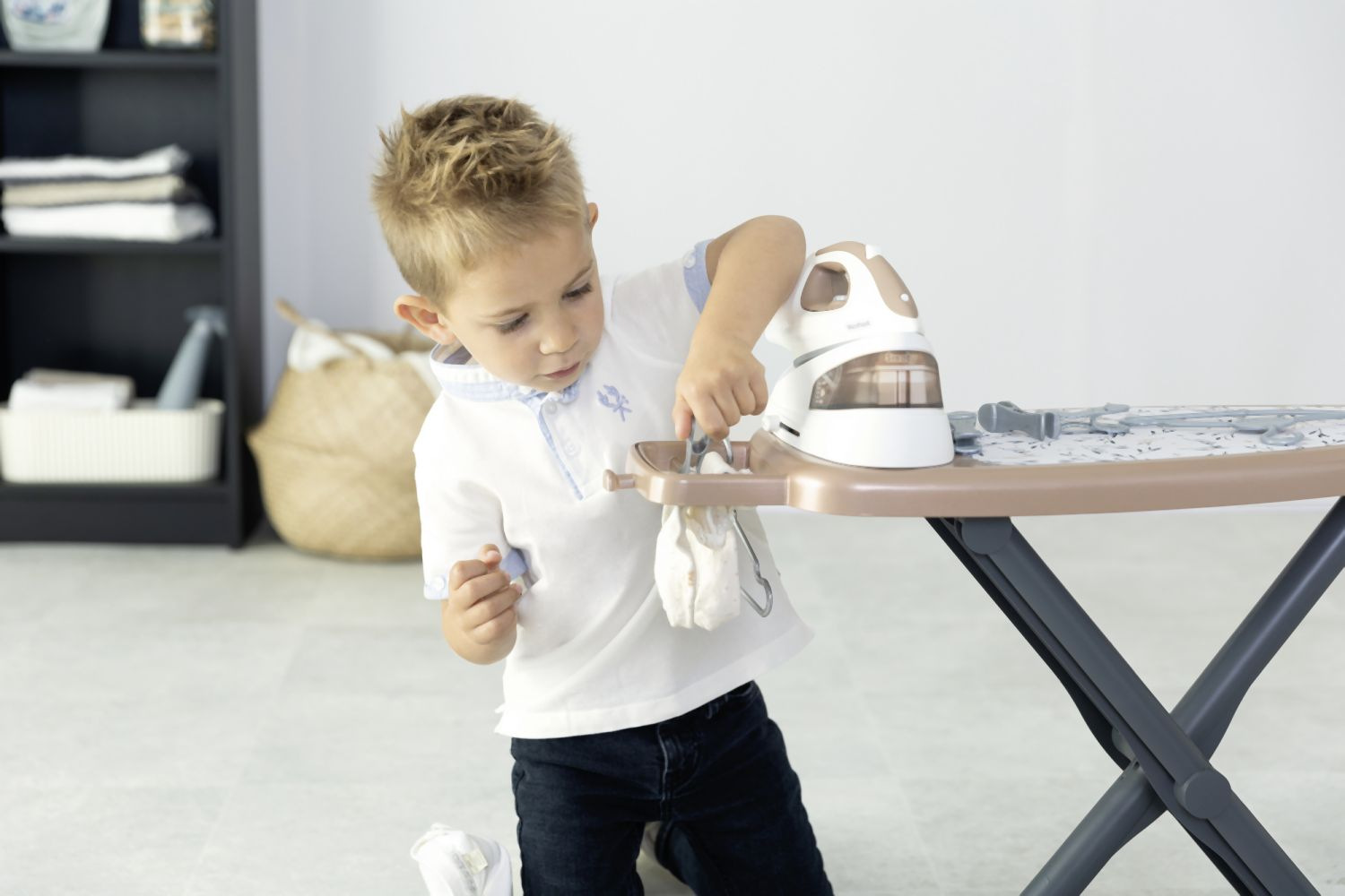 Realistické žehlicí prkno s parní stanicí Tefal, včetně žehličky s mechanickým otočným knoflíkem se zvukem "crick-crack". Součástí 2 ramínka, 4 kolíčky na prádlo a lahvička se sprejem na prádlo. Žehlicí prkno lze rychle složit. Rozměry produktu (DxŠxV): 23x 48 x 48,5 cm.