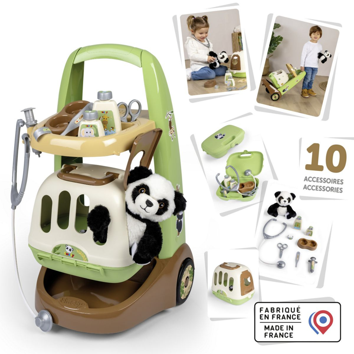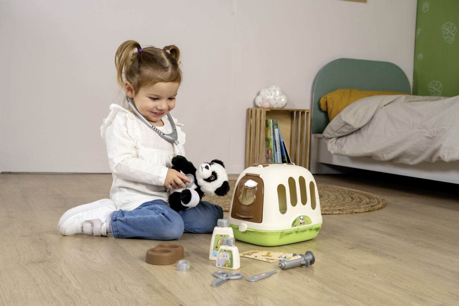 Veterinární vozík s měkkou plyšovou pandou, přepravním boxem 2 v 1 s odnímatelným mobilním lékařským kufrem a spoustou příslušenství. Díky kolečkům s lehkým chodem je mobilní lékařský vozík ovladatelný a lze jej snadno řídit. Příslušenství obsahuje vše, co skutečný veterinář potřebuje k léčbě svých čtyřnohých pacientů: stetoskop, injekční stříkačku, nůžky, misku s krmivem pro zvířata, náramek a dvě lahvičky (šampon nebo lék). Roztomilá panda doplňuje tuto hravou sadu pro veterináře, stejně jako skvělý kufr 2 v 1, který lze použít jako přepravní box pro zvířátka i jako pojízdný kufřík pro veterináře, který lze používat i samostatně. K tomu lze pouzdro z horní části jednoduše odepnout a veškeré příslušenství lze snadno umístit dovnitř pouzdra. Rozměry produktu (DxŠxV): 31 x 32,1 x 55,2 cm.