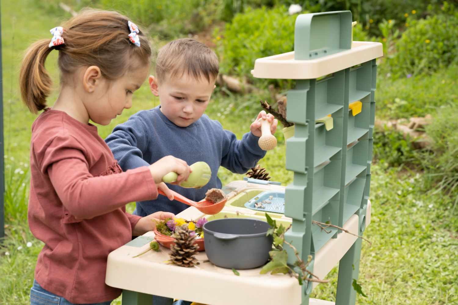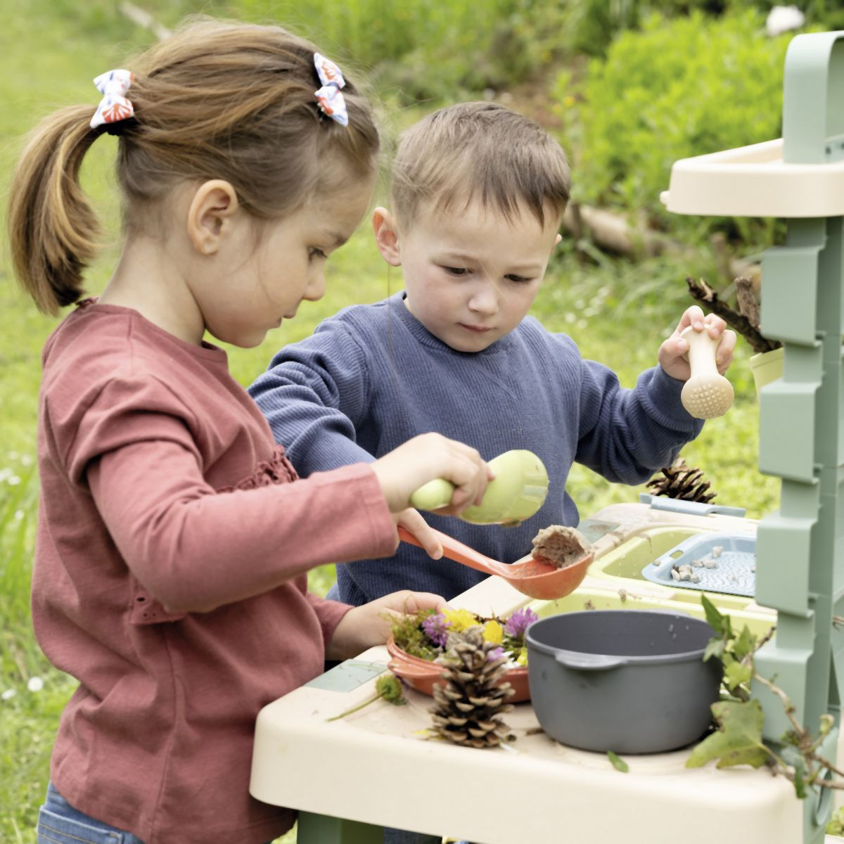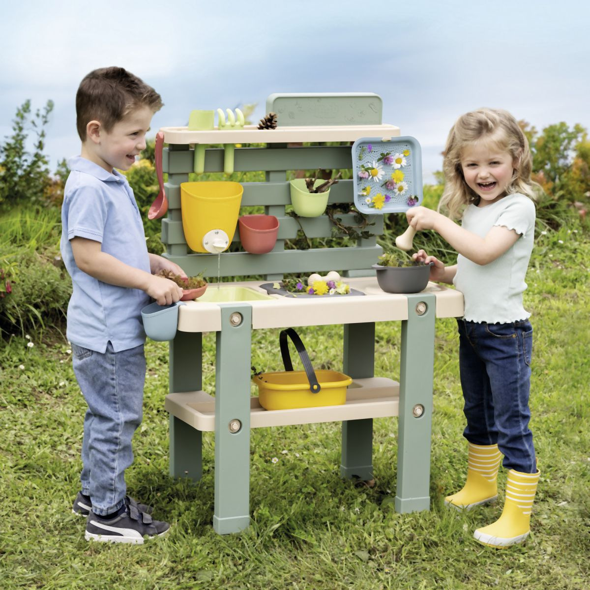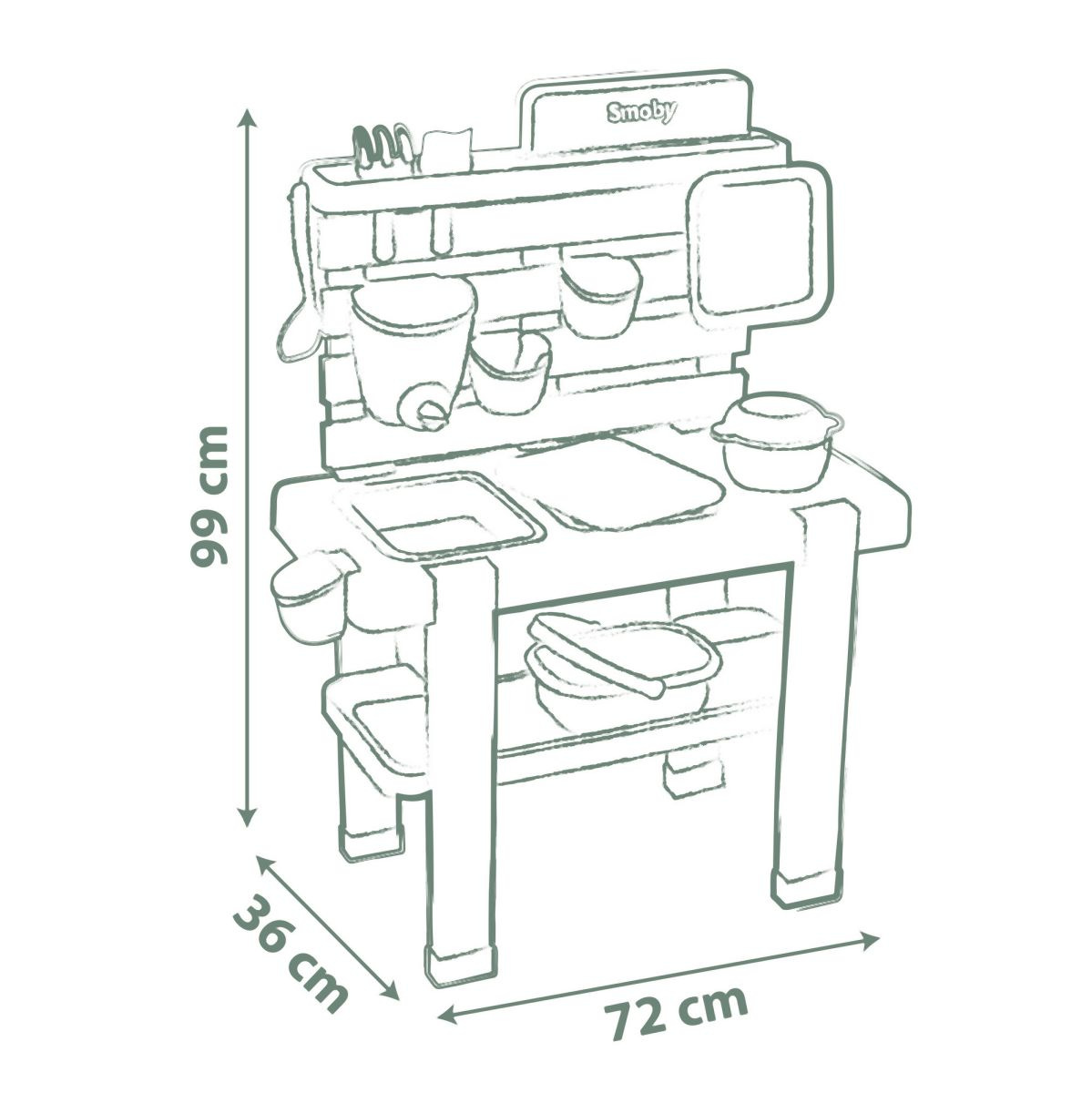 Venkovní kuchyňka vybavená různým příslušenstvím, celkem 15 ks doplňků. Plastové díly jsou ošetřeny anti-UV, což zajišťuje dobrou odolnost a stálost barev v průběhu času. Tento výrobek obsahuje minimálně 90% recyklovaného materiálu. Rozměry výrobku (DxŠxV): 72 x 36 x 99 cm.