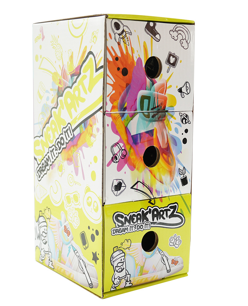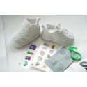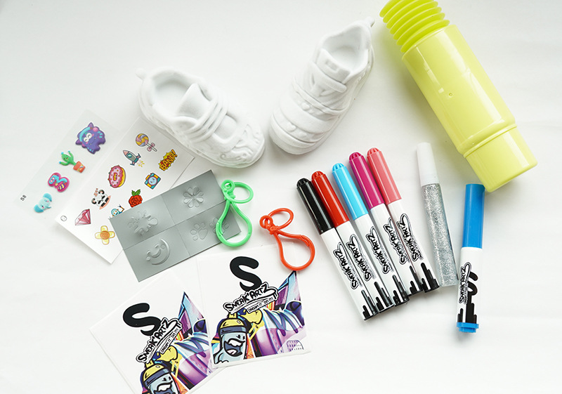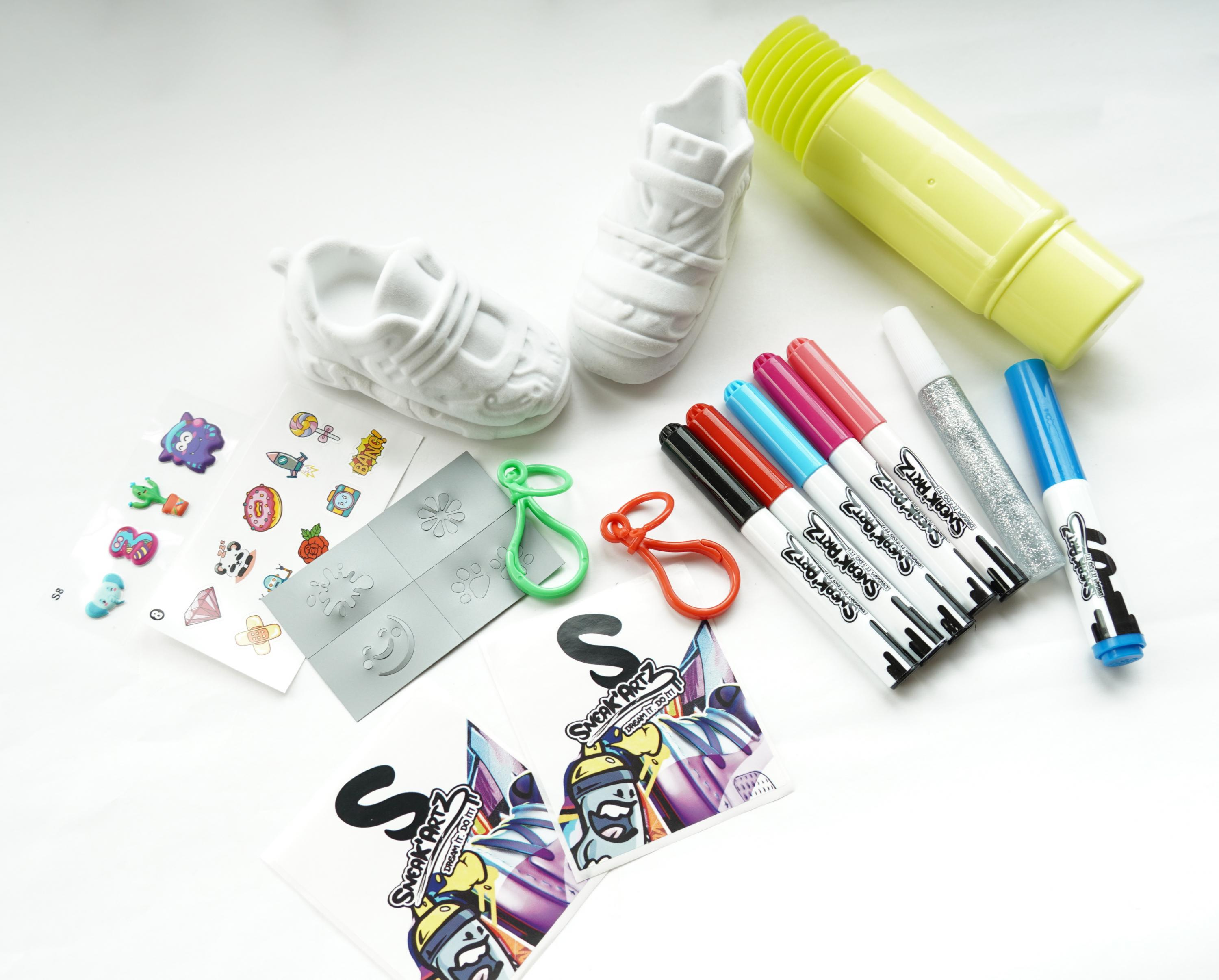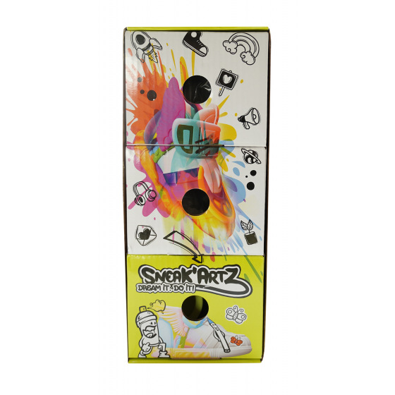 Vždy jste snili o tom mít tenisky, které nevypadají jako ostatní? S Sneak'artz si můžete vyrobit vlastní botu! Navrhněte a vytvořte svůj design se všemi přiloženými doplňky. Balení obsahuje: 2 tenisky, 1 třpytky, 6 dekoračních fixů (lze použít i jako foukací), plastické samolepky, samolepky, 2 přívěsky a seznam tenisek, kde si označíš, jakou tenisku máš. Nasbírej všech 24 druhů. Svou tenisku si můžeš pověsit třeba na batoh nebo klíče.