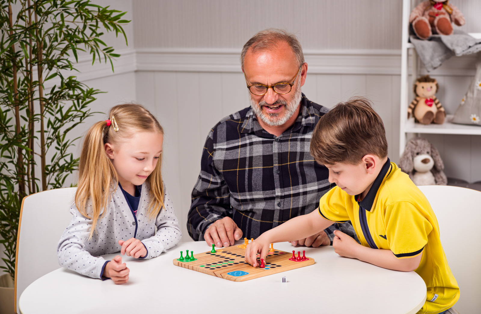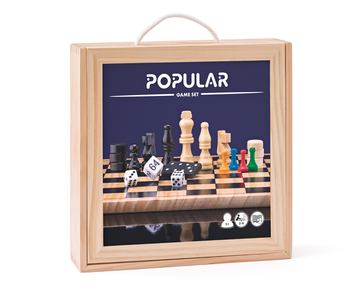 Soubor stolních her v jednom velkém setu. Dřevěný box, v kterém jsou umístěny 2 oboustranně potištěné hrací desky pro jednotlivé společenské hry (šachy, dáma, backgammon, člověče, nezlob se, čínská dáma, mlýn). Ke každé společenské hře zde najdete i příslušné figurky a hrací kosty. I víko hracího setu je využito jako další hrací plocha. Součástí setu jsou i hrací kameny domina. Věk: 5+