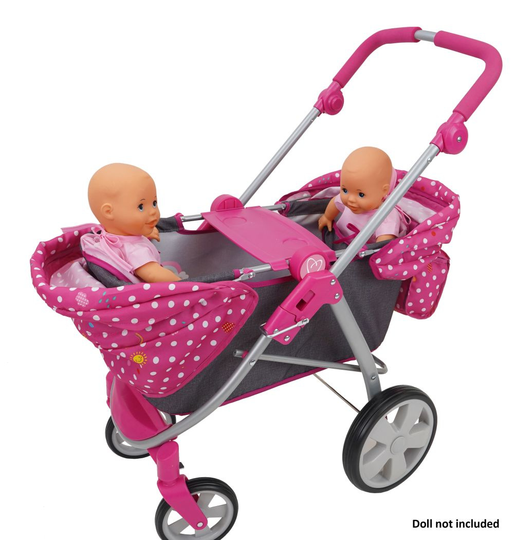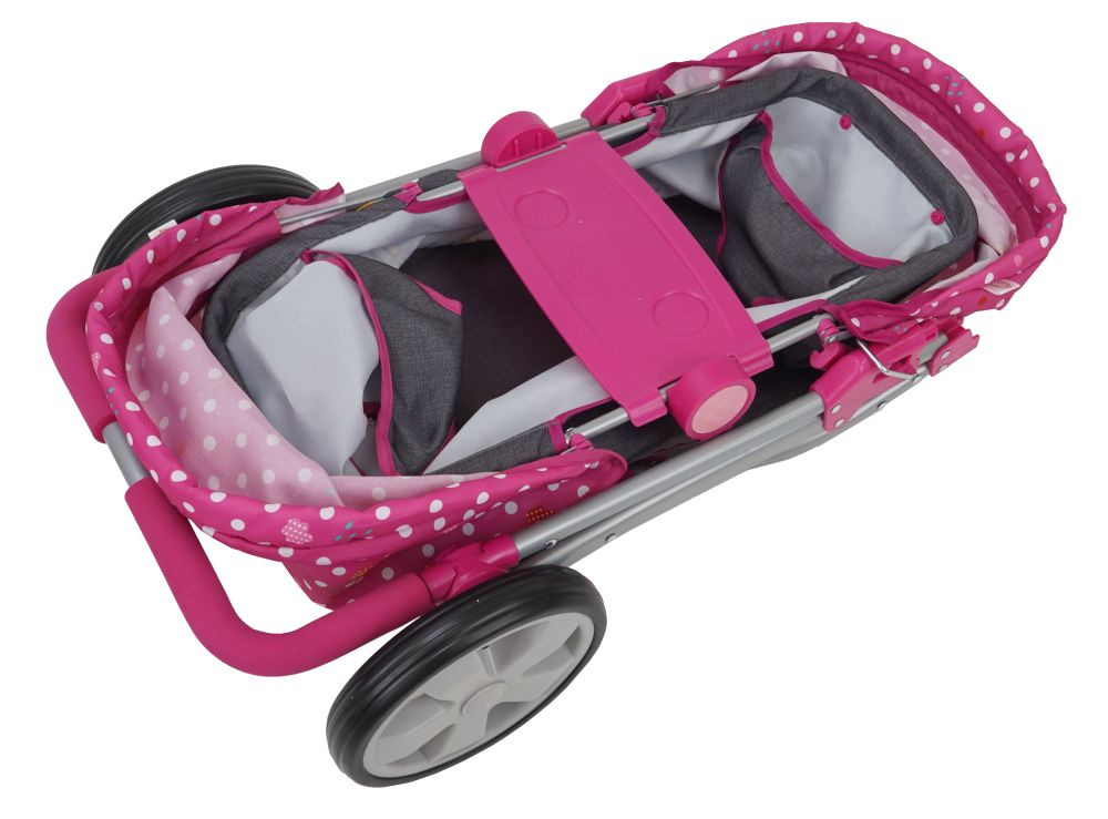 Kočárek vhodný pro panenky do cca. 53 cm. Pro děti od 3 let. \n• Nastavitelná výška rukojeti je cca. 46 - 72 cm\n• Otočné přední kola\n• Skládací rám pro snadné skladování\n• Měkká pěnová rukojeť\n• Obsahuje 2 zatahovací stříšky a tašku na uložení věcí