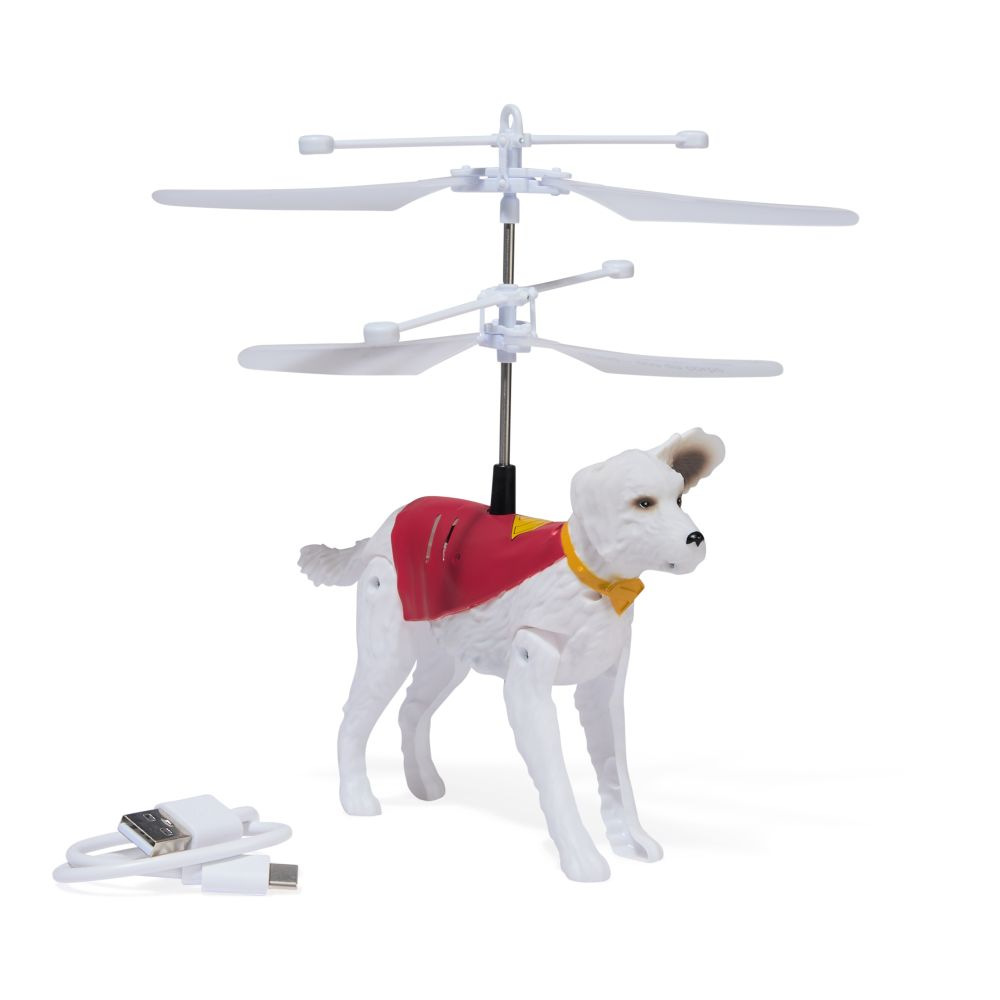 Interaktivní létající pes Krypto. Zapněte jej na břišní straně. Rozočí se vrtule a začne se vznášet. Pomalu ve vzuchu klesá, ale má senzor a pokud pod něj dáte svou dlaň, začne opět stoupat vzhůru.