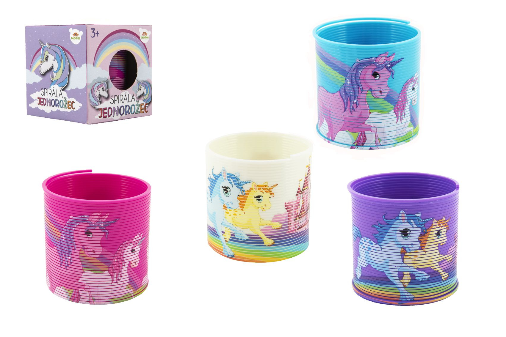 Popis Spirála/ pružina jednorožec plast průměr 6,5cm 4 barvy v krabičce 7x7x7cm