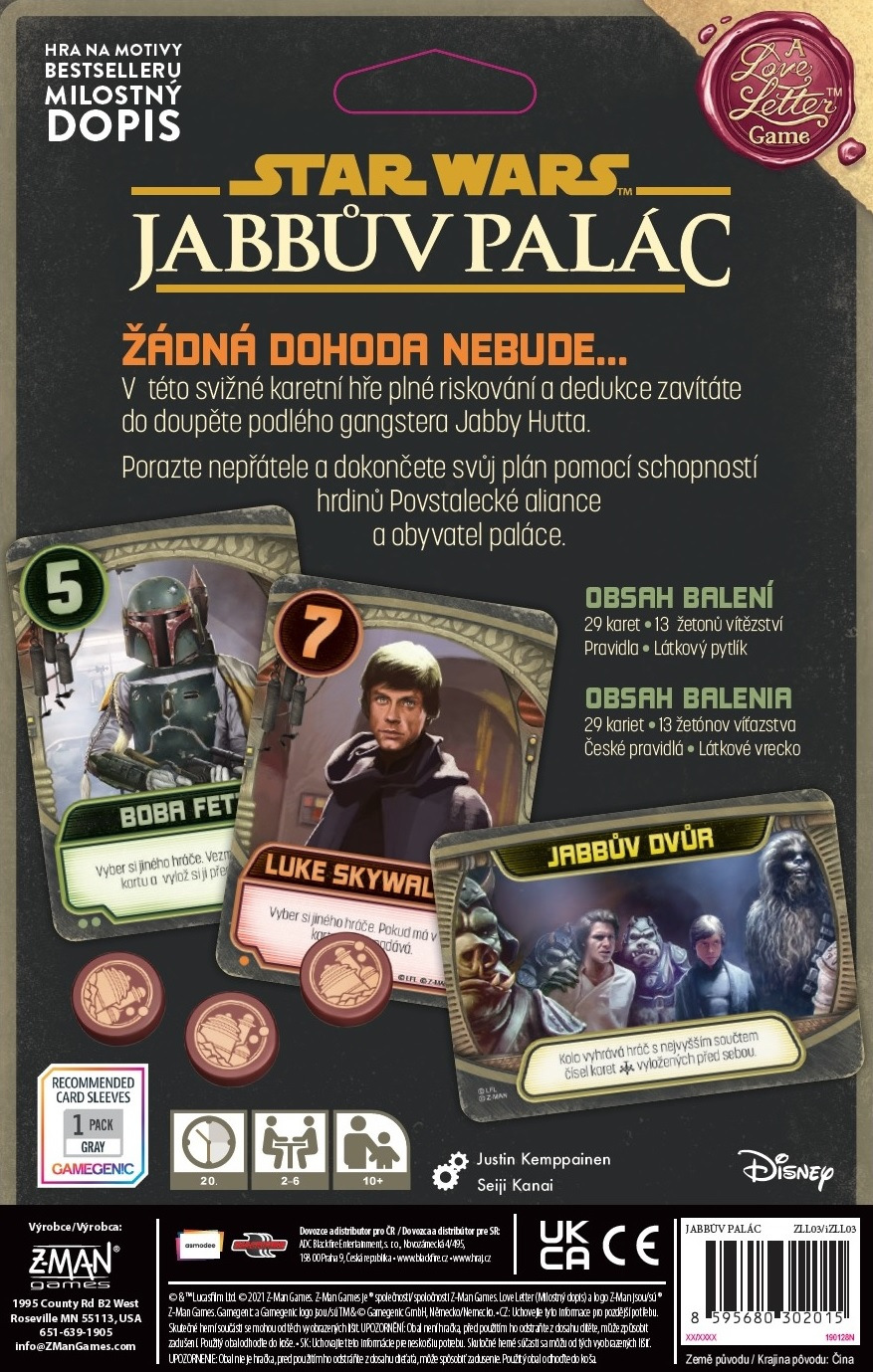 Vítejte v Jabba Huttově paláci. Porazte nepřátele a dokončete svůj plán pomocí schopností hrdinů Povstalecké aliance a obyvatel paláce. Star Wars: Jabbův palác je karetní hra postavená na mechanikách oblíbeného Milostného dopisu, avšak přináší několik nových prvků, které mění hratelnost. Na své si přijdou fanoušci klasické hry i Star Wars licence. Do rukou se vám dostanou ikoničtí hrdinové i záporáci, jako princezna Leia, Han Solo nebo samotný Jabba Hutt.