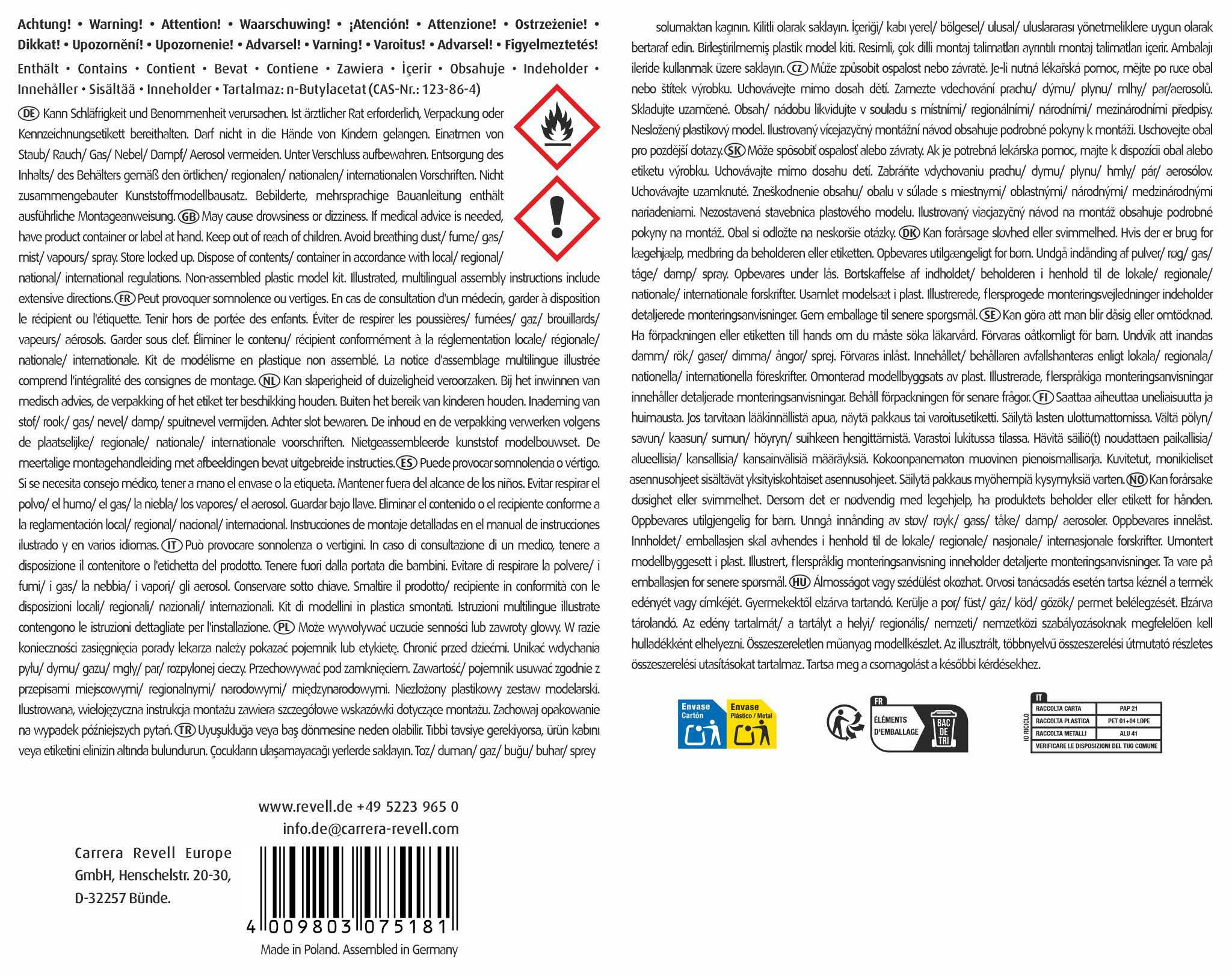 Varování! Obsahuje: n-Butylacetat. Hořlavá kapalina a páry. Může způsobit ospalost nebo závratě. Je-li nutná lékařská pomoc, mějte po ruce obal nebo štítek výrobku. Uchovávejte mimo dosah dětí. Před použitím si přečtěte údaje na štítku. Chraňte před teplem/jiskrami/otevřeným plamenem/horkými povrchy. Zákaz kouření.Tento výrobek není hračka!