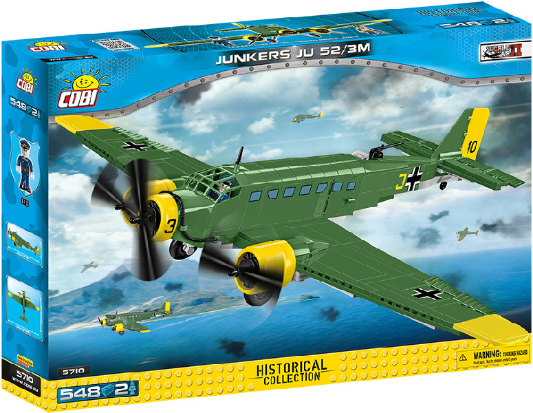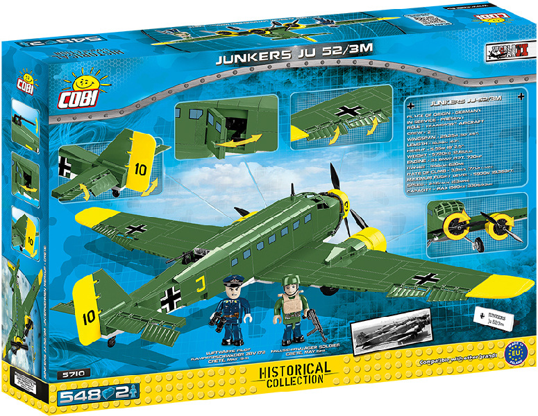 Postavte si model Junkers JU 52, nejznámějšího třímotorového německého letadla z 2. světové války. Letoun původně navržený pro přepravu cestujících a zboží se ukázal jako vynikající ve vojenském letectví. V počáteční fázi války byl také používán jako tzv. pomocný bombardér. Po úpravách táhl kluzáky přistávacích sil. Letoun JU 52 přepravoval četné přistávací jednotky na všech frontách války. Nejznámější operace, kterých se JU 52 zúčastnil, jsou: útok na Řecko, operace Merkur (přistání na Krétě) a pomoc 6. armádě polního maršála Pauluse v bitvě u Stalingradu. Po 2. světové válce byl JU 52 vyráběn ve Francii pod názvem AAC 1 Toucan a ve Španělsku jako CASA C352-L. Jednotlivé stroje najdete v provozu dodnes! Balení obsahuje 548 kostek stavebnice a 2 figurky.